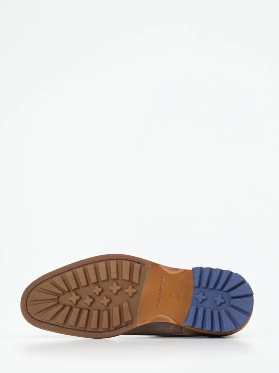 Vielseitiger Begleiter für Büro und Freizeit.Floris van Bommel interpretiert den Desert Boot auf moderne Weise. An regnerischen Herbsttagen bietet dieser robust gearbeitete Herrenschuh aus taupefarbenem Veloursleder mit feiner Narbung zuverlässigen Halt und Stil. Die klassische, leicht verschlankte Form mit Vierloch-Schnürung wird durch den cognacfarbenen Fersenbesatz akzentuiert. Eine mehrlagige, teils blau akzentuierte Gummisohle mit griffigem Profil ergänzt das Design funktional und visuell. Kalblederfutter und Wechselfußbett sorgen für Tragekomfort im Alltag. Der Look verbindet heritage-inspirierte Details mit urbaner Lässigkeit und passt ideal zu Chinos oder Raw-Denim. Ein authentischer Stilbaustein – präzise gefertigt mit charakteristischer Handschrift.