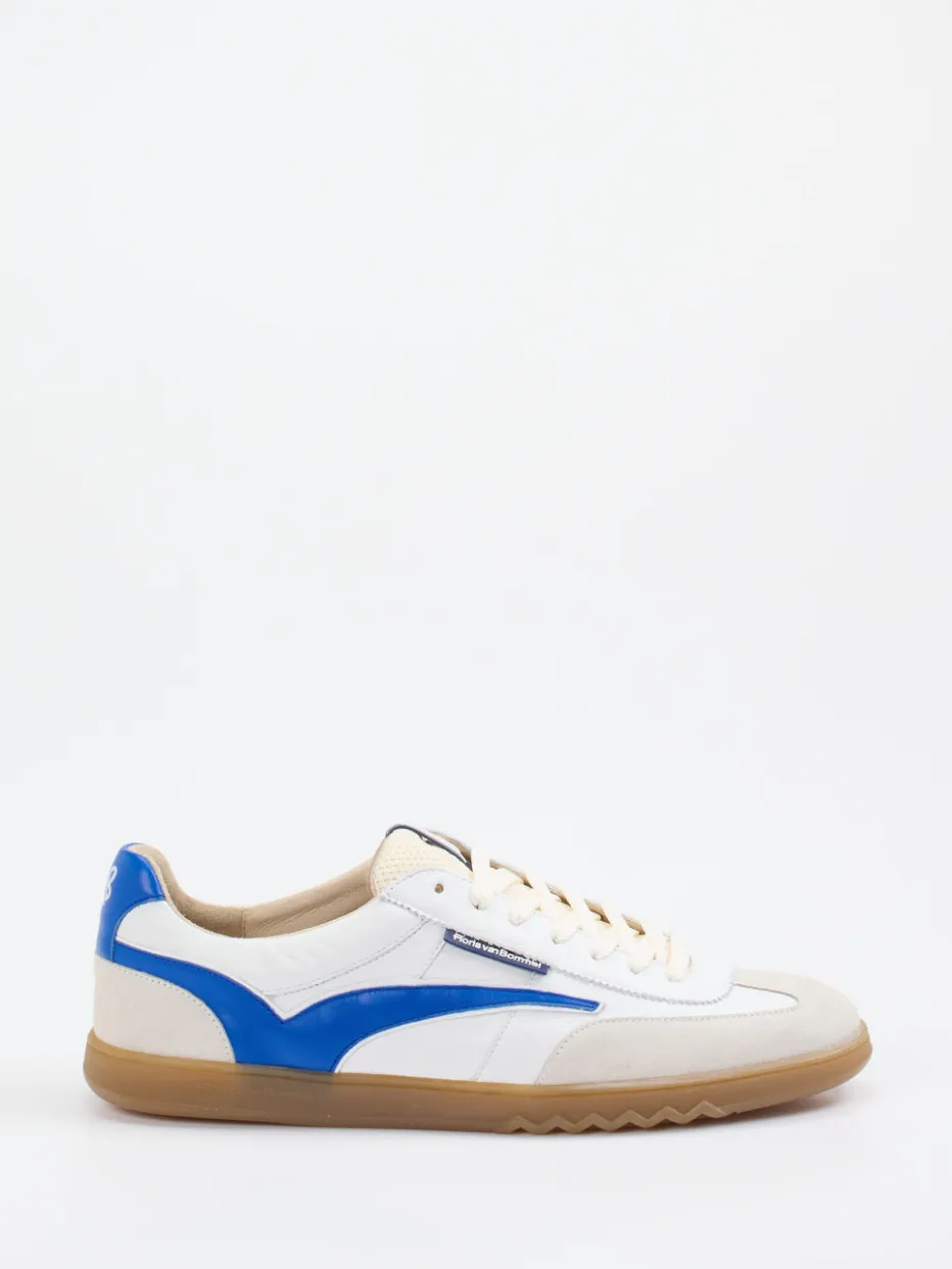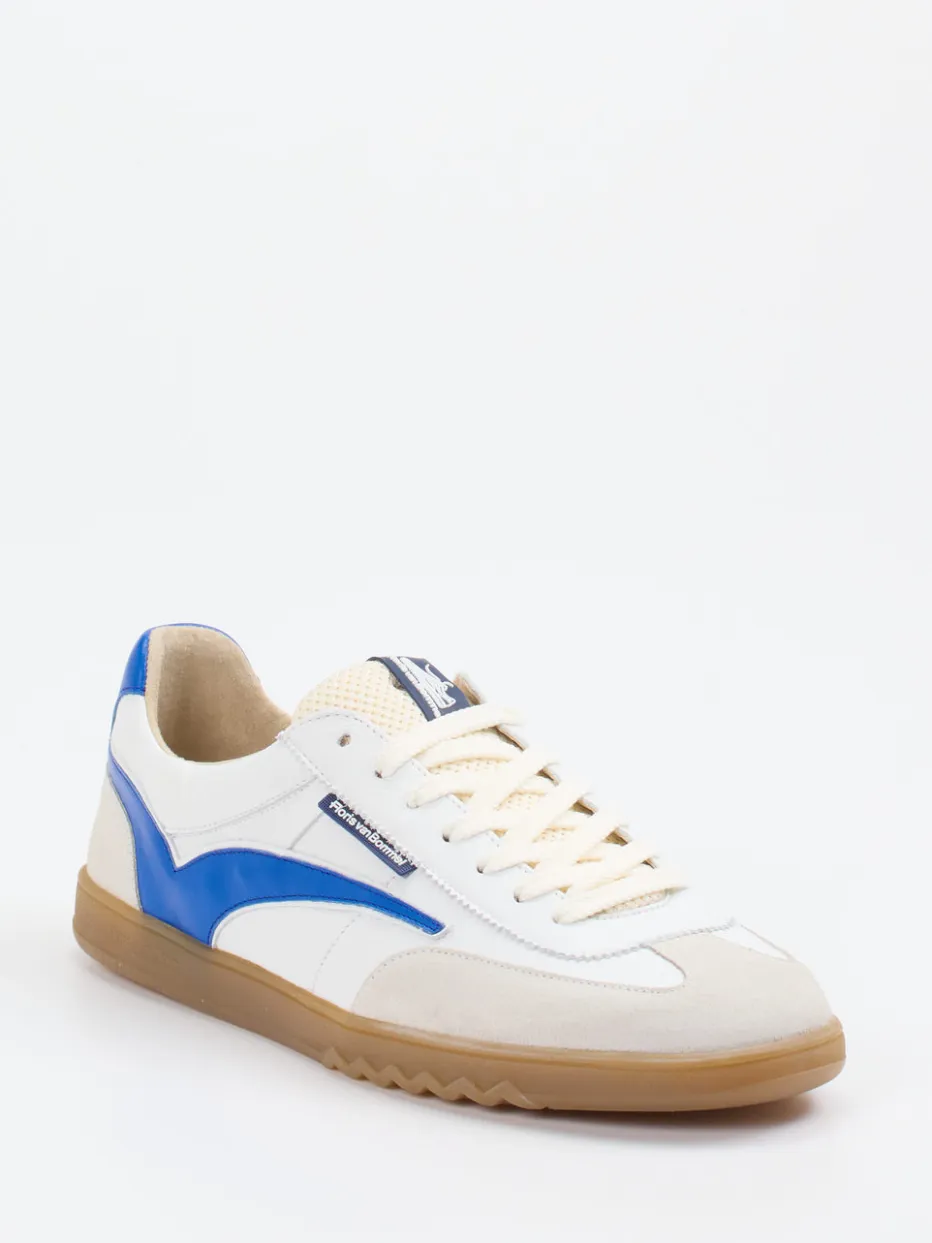 90er-Vibes für moderne Casual-Styles.Floris van Bommel bringt mit diesem Retro-Sneaker für Herren frischen Schwung in die Freizeitgarderobe. Perfekt für entspannte Sommertage in der Stadt verbindet das Modell weißes Kalbleder mit einer samtigen Veloursleder-Flügelkappe und einer atmungsaktiven Mesh-Zunge. Farbige Akzente in Kobaltblau und Beige sorgen für einen markanten Kontrast zur cleanen Basis. Details wie Logo-Tag, Zungen-Patch und Fersenprint unterstreichen den individuellen Streetstyle-Charakter. Mit flacher Gumsohle und austauschbarem Fußbett ausgestattet, bietet er den Komfort eines modernen Everyday-Sneakers. Besonders gut kombinierbar mit hellen Cargohosen oder Shorts. Ein authentisches Statement-Piece im „Retro Runner Revival“-Trend mit typischer Van-Bommel-Präsenz.