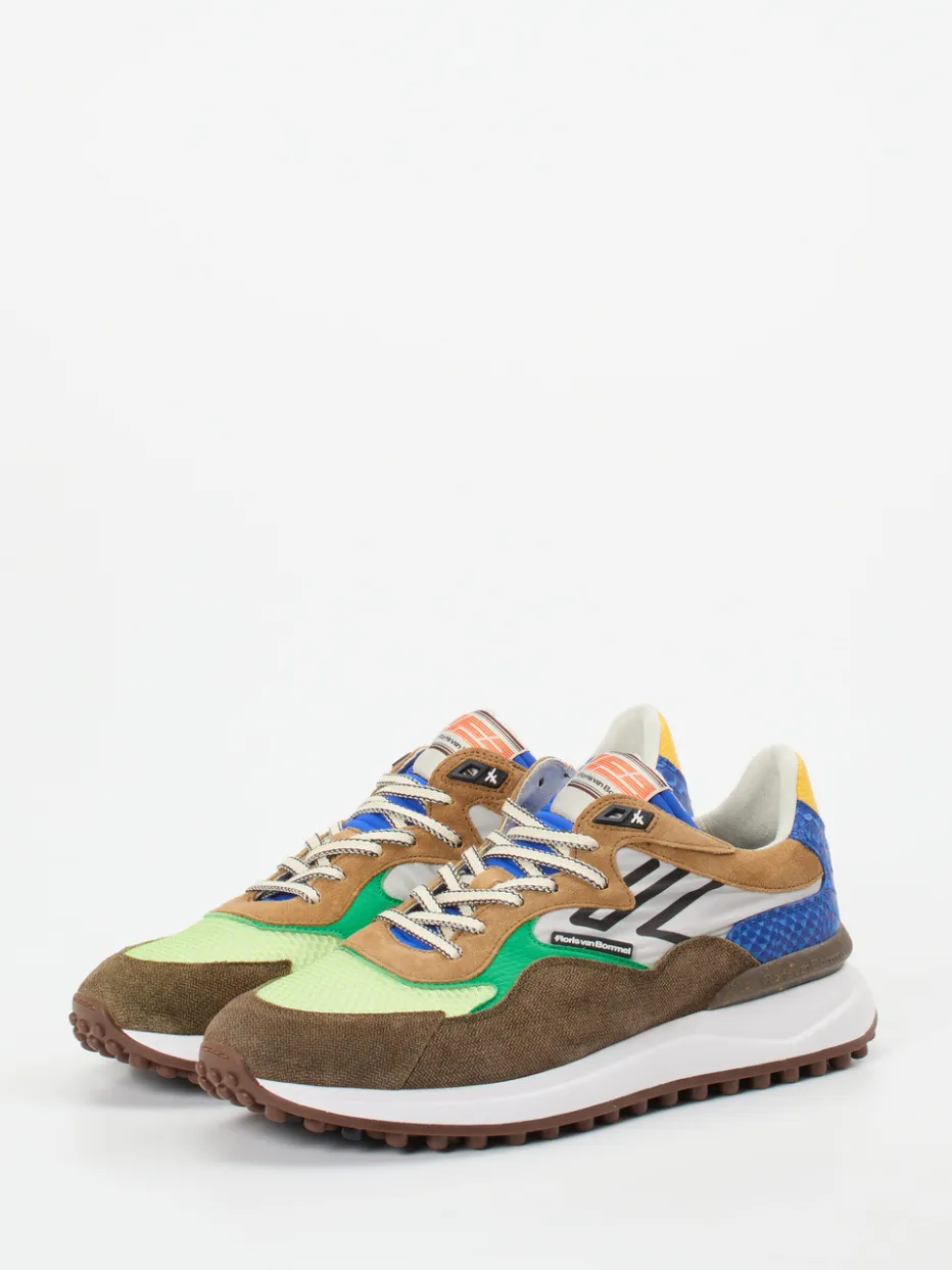 Statement in Braun und Multicolor.Der Herrensneaker von Floris van Bommel vereint Retro-Ästhetik mit modernem Streetstyle. Mit seiner sportlich-dynamischen Low-Cut-Silhouette erfüllt er den Anspruch an einen alltagstauglichen Begleiter mit individuellen Akzenten. Veloursleder trifft auf strukturiertes Druckleder, Mesh und Textil – das ergibt eine markante Oberfläche mit spürbaren Kontrasten. Das Multicolor-Design in Braun, Grün, Blau, Gelb und Beige unterstützt den aktuellen Color-Blocking-Trend. Dank EVA-Noppensohle mit starkem Profil läuft es sich komfortabel und sicher. Stylishe Kombi: Jogpants oder Cargohosen unterstreichen den expressiven Look. Floris van Bommel verbindet handwerkliches Know-how mit progressivem Designanspruch.