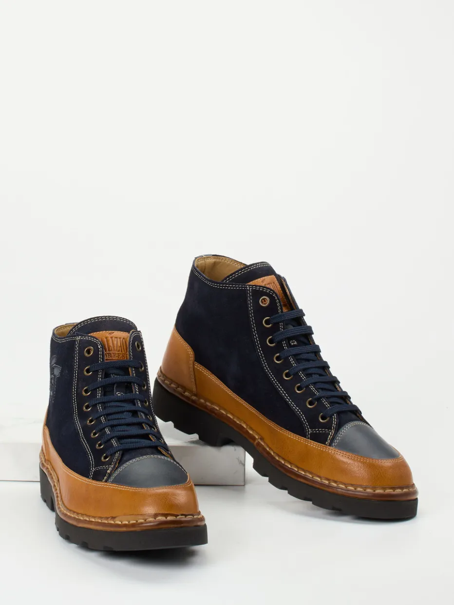 Stilvoll unterwegs im Alltag und Outdoor.Die Herren-Schnürboots von Galizio Torresi vereinen hochwertigen Materialeinsatz mit funktionaler Ästhetik. Für entspannte Herbstspaziergänge im urbanen Terrain bieten diese knöchelhohen Boots alles, was moderne Casual-Looks verlangen. Das dunkelblaue Veloursleder trifft auf karamellfarbenes Glattleder – samtig angeschliffen und glatt strukturiert. Kontrastnähte, die profilierte Gummisohle und das geprägte Seitenlogo unterstreichen die robuste Wirkung. Stilvoll ergänzt werden Workwear-inspirierte Outfits mit diesen Retro-Boots im „Urban Hiking“-Trend, funktional dank Schnürung mit Metallösen. Komfort, Stil und Lederqualität – eindrucksvoll kombiniert durch Galizio Torresi.