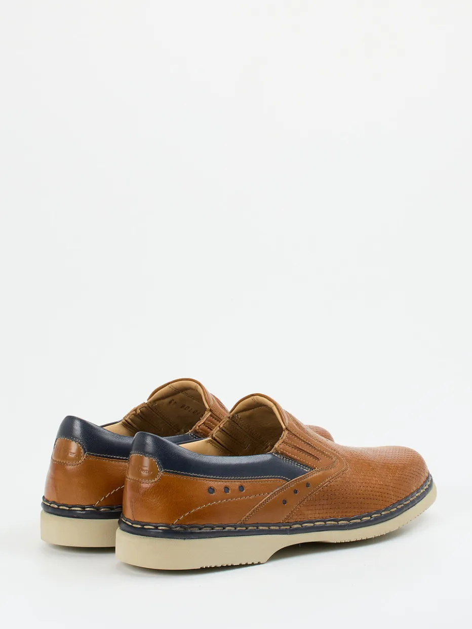 Dieser handgefertigte Komfortslipper kombiniert cognacfarbenes Kalbleder mit dunkelblauen Kontrastakzenten und eleganter Flechtprägung. Ideal für stilbewusste Herren mit Sinn für Qualität und Tragekomfort.