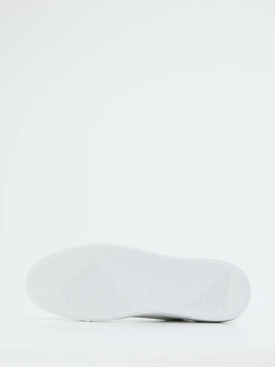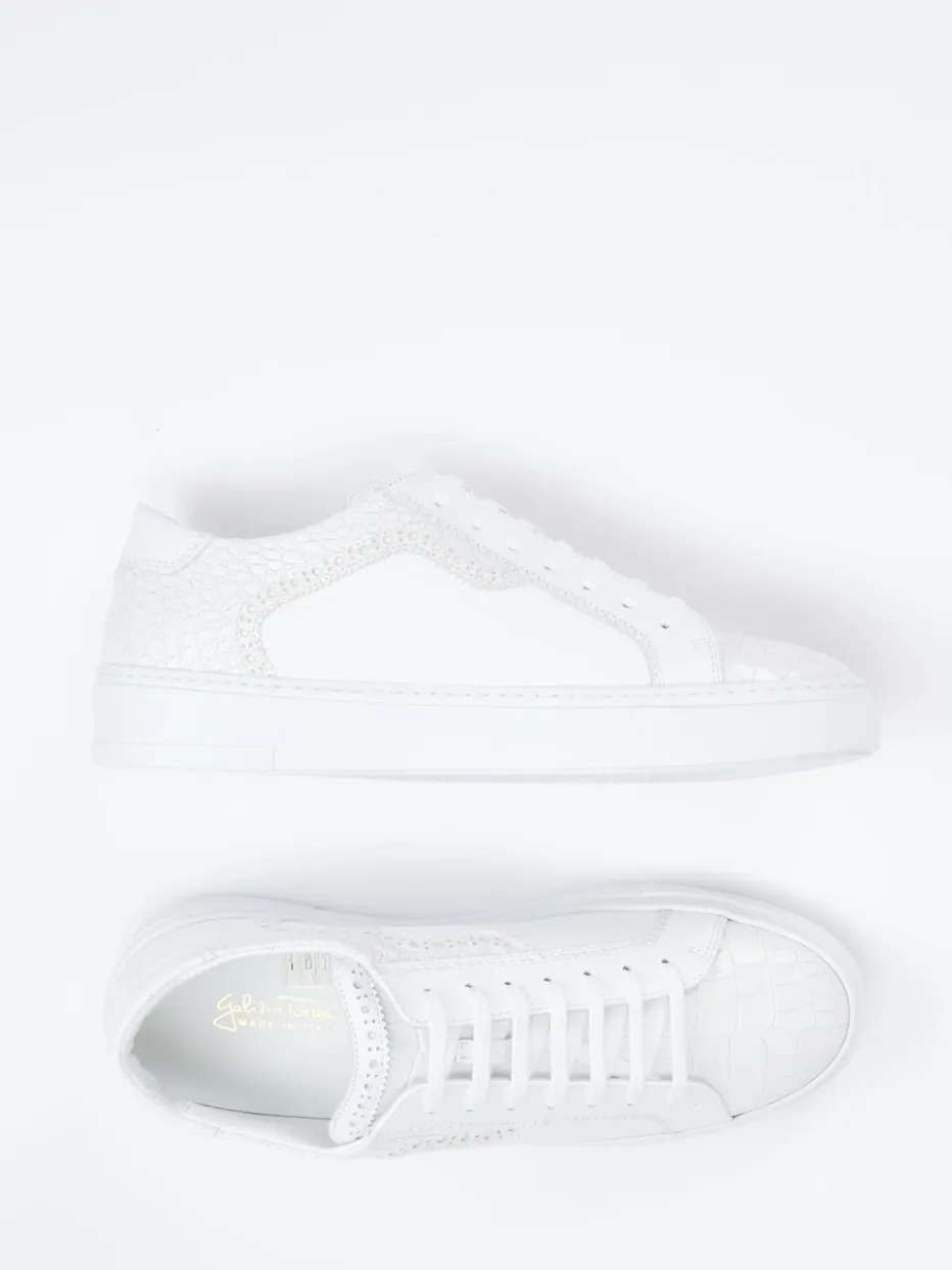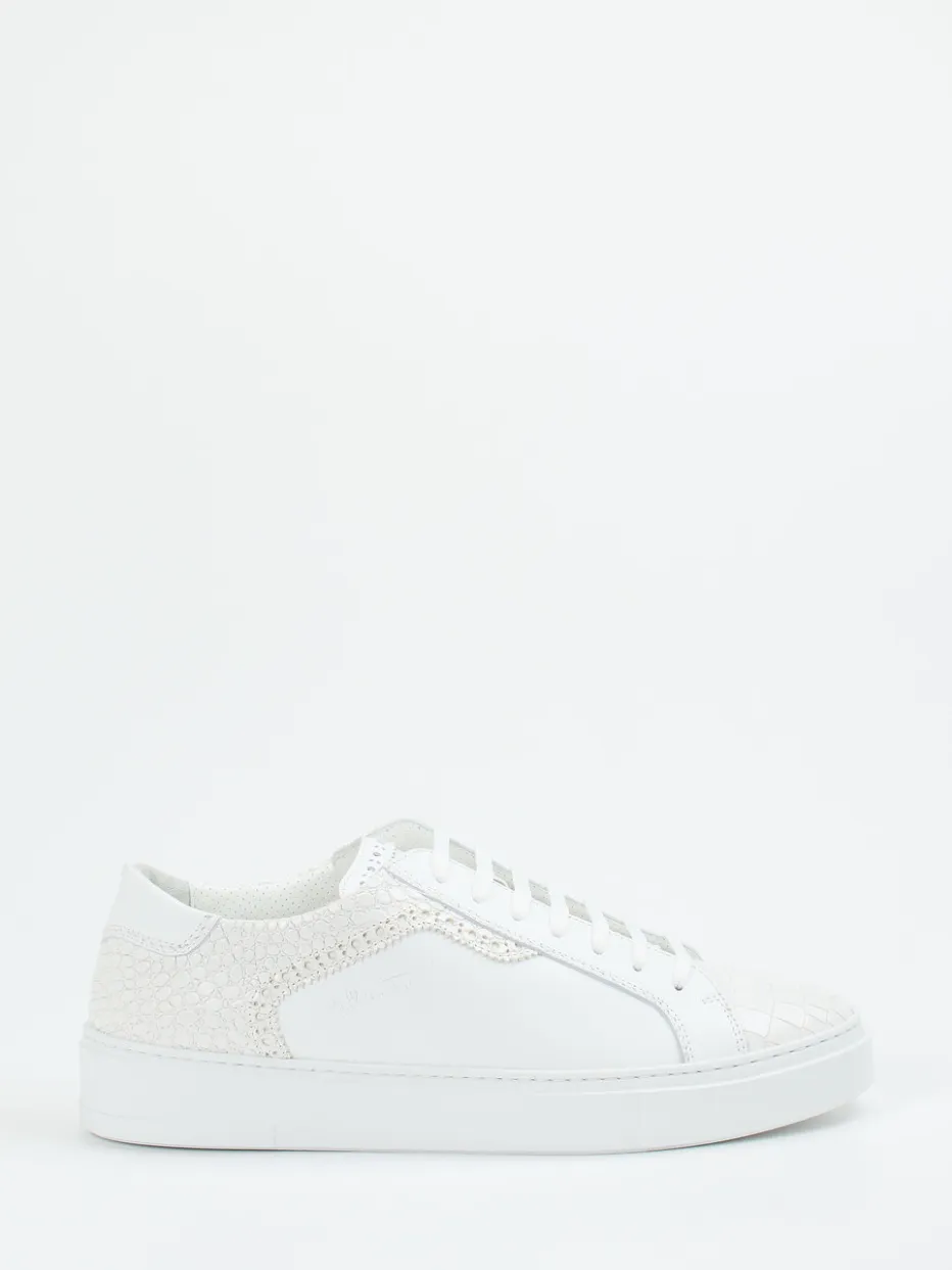 Reduziertes Design mit Struktur.Die italienische Marke Galizio Torresi präsentiert mit diesem Sneaker ein klares Beispiel für stilvolle Zurückhaltung. Ideal für urbane Looks zwischen Büro und Freizeit: Der Low-Top-Sneaker aus weißem, geprägtem Kalbleder kombiniert glatte und krokostrukturierte Partien mit glänzender Oberfläche. Eine perforierte Zunge, das dezente Markenlogo und eine schlichte Silhouette unterstreichen den modernen Quiet-Luxury-Stil. Die rutschhemmende Gummisohle bietet sicheren Halt, das ledergefütterte Innenleben sorgt für Komfort. Perfekt zur hellen Stoffhose oder monochromen Ensembles. Ein vielseitiger Begleiter mit hohem Anspruch an Material und Design.