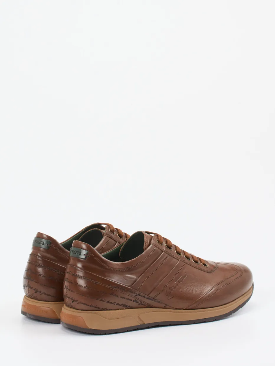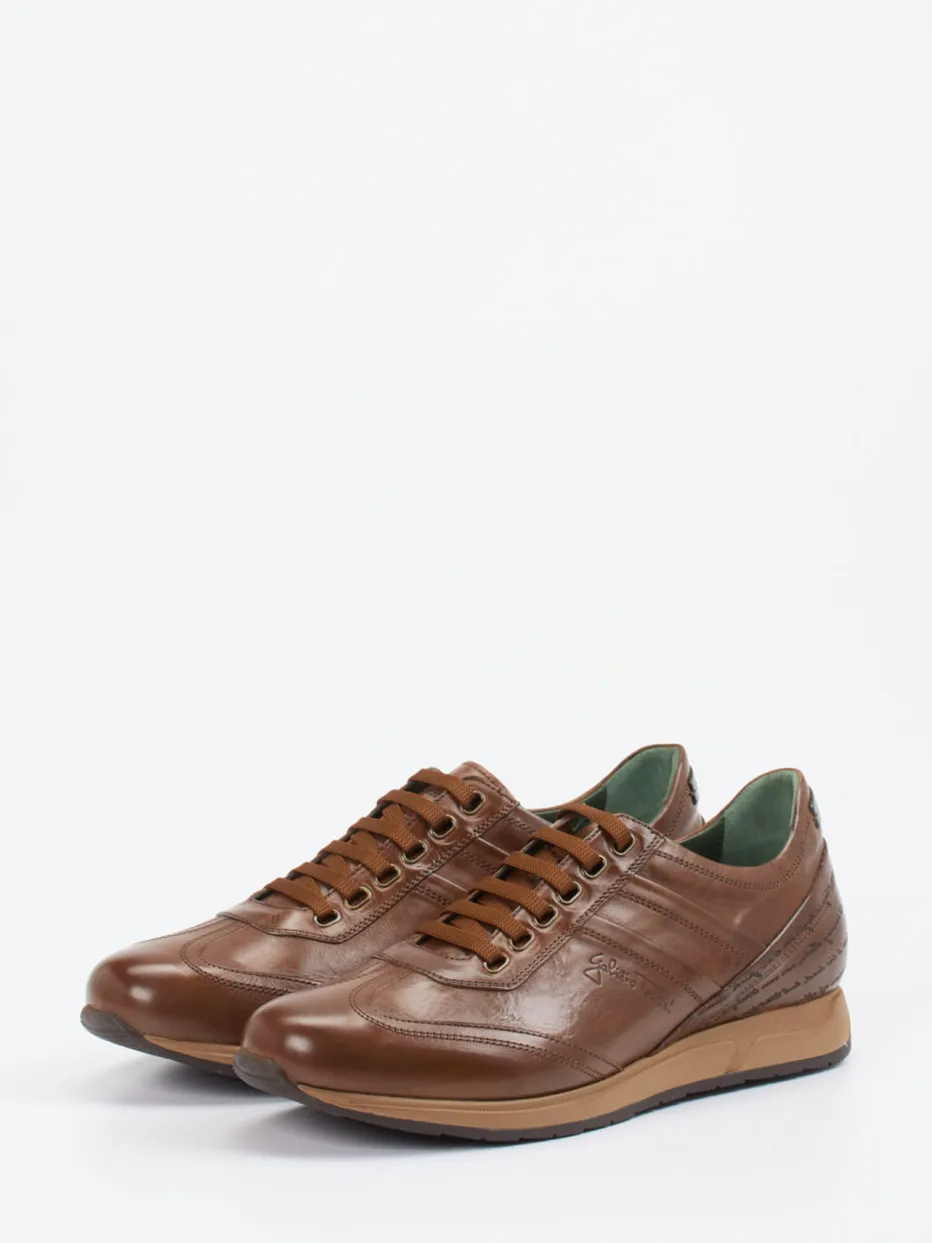 Italienischer Stil mit Understatement.Galizio Torresi präsentiert mit diesem Sneaker ein Herrenmodell, das sportliche Lässigkeit mit luxuriösem Anspruch verbindet. Der Schuh aus hochwertigem, glänzend veredeltem Kalbleder überzeugt in sattem Mittelbraun mit Ton-in-Ton-Nähten und einer feinen seitlichen Schriftprägung. Die klassische, leicht sportliche Silhouette wird ergänzt durch eine robuste Gummisohle und eine komfortable Schnürung. Der gepolsterte Schaftrand sowie ein Lederfutter sorgen für angenehmen Tragekomfort – auch für Einlagenträger geeignet. Als stilvoller Vertreter des „Quiet Luxury“-Trends passt er ideal in smarte Freizeitlooks und moderne Business-Kombinationen. Italienische Qualität trifft auf zeitlose Eleganz mit Liebe zum Detail.