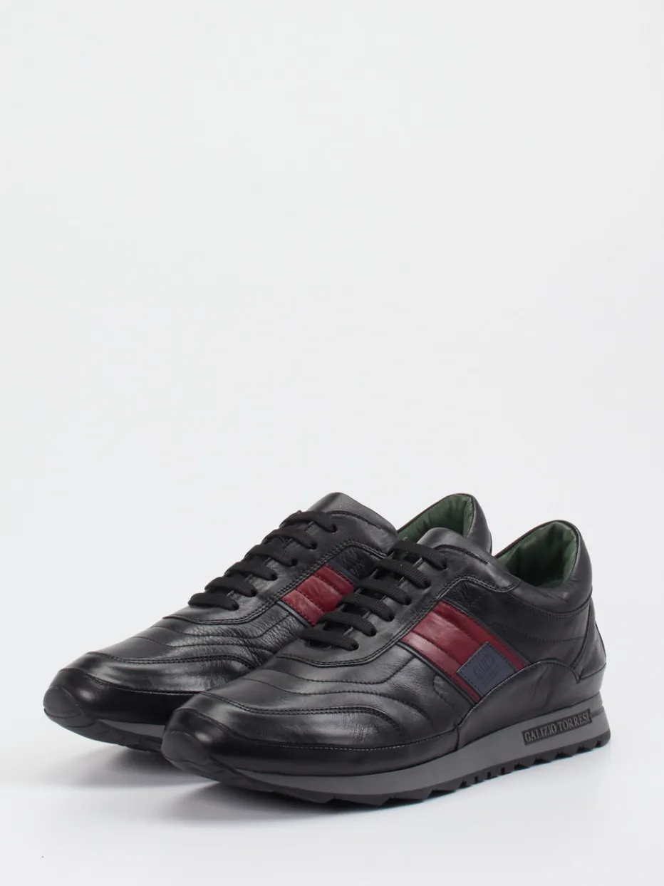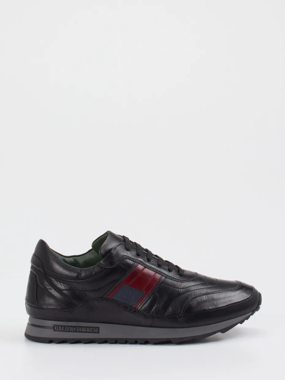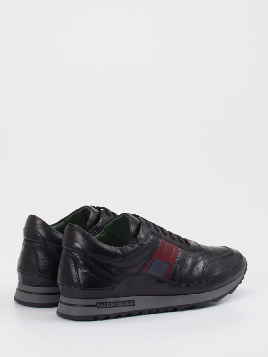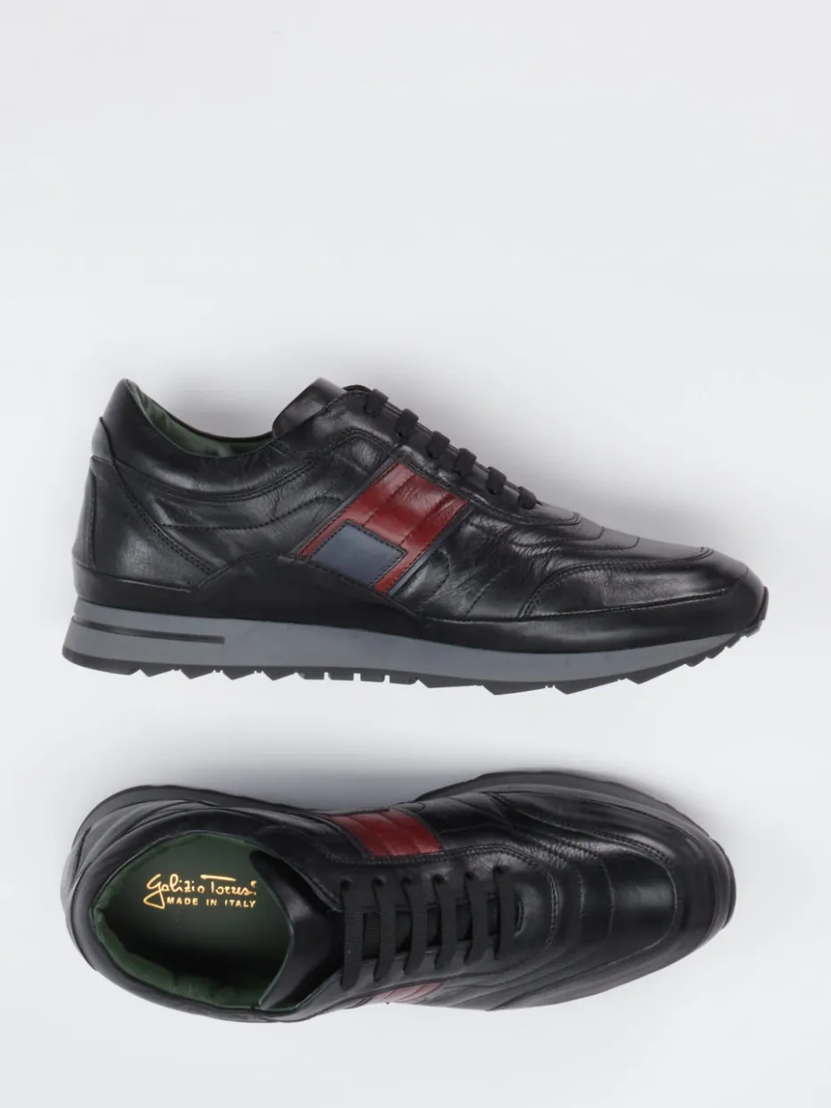 Business-Casual neu interpretiert.Galizio Torresi präsentiert einen modernen Sneaker für Herren. In gepflegten Alltagsmomenten oder im urbanen Berufsleben überzeugt dieser Sneaker durch hochwertige Verarbeitung und komfortable Linienführung. Das genarbte Kalbleder in klassischem Schwarz trifft auf farbige Seitenstreifen in Bordeauxrot und Dunkelblau, die subtil für visuelle Dynamik sorgen. Eine profilierte Gummisohle sorgt für sicheren Halt, das Lederfutter unterstützt ein ausgewogenes Trageklima. Mit sportlich-flacher Silhouette, Schnürung und gepolstertem Schaft eignet sich das Modell gleichermaßen für klassische und komfortaffine Looks. Minimalistische Details wie das geprägte Sohlenlogo runden das Design harmonisch ab. Ein stilbewusster Begleiter, der Qualität und Understatement vereint.