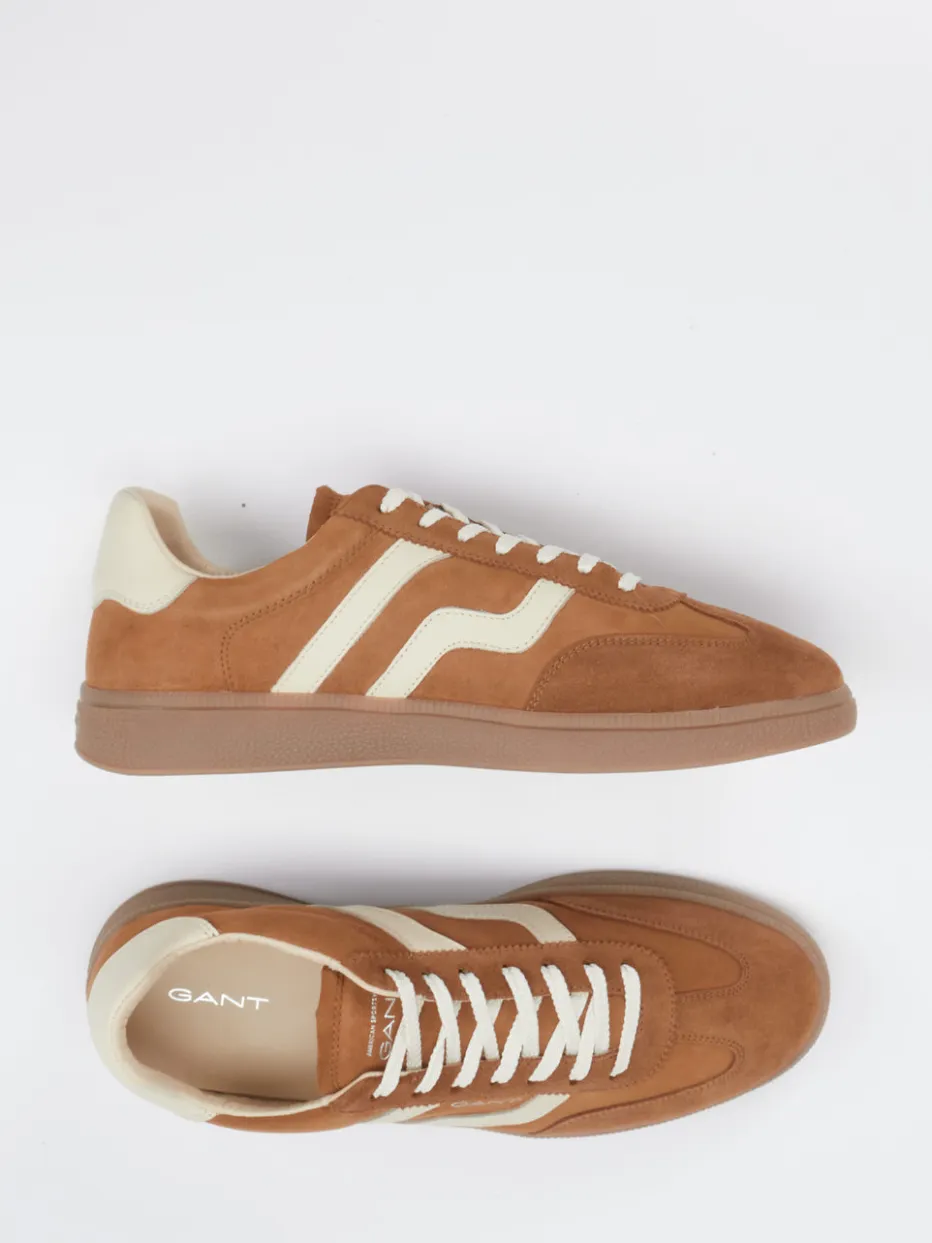 Für lässige Tage mit Stil.Gant präsentiert einen Retro-Sneaker für Herren, gefertigt aus edlem Veloursleder in warmem Rostbraun. Ob beim Stadtspaziergang oder entspannten Reisen – die flache, rund geschnittene Silhouette mit gepolstertem Fersenbereich verspricht bequemen Tragekomfort. Das samtig angeschliffene Veloursleder harmoniert mit cremefarbenen und hellbraunen Kontrasteinsätzen und Ton-in-Ton-Nähten. Eine rutschfeste Gummisohle und dezente Seitenstreifen mit Vintage-Charme ergänzen das Design. Der Schuh passt ideal zu Chinos oder Jeans und rundet moderne Freizeit-Outfits ab. Retro-inspirierte Leichtigkeit trifft auf die klare Handschrift von Gant.