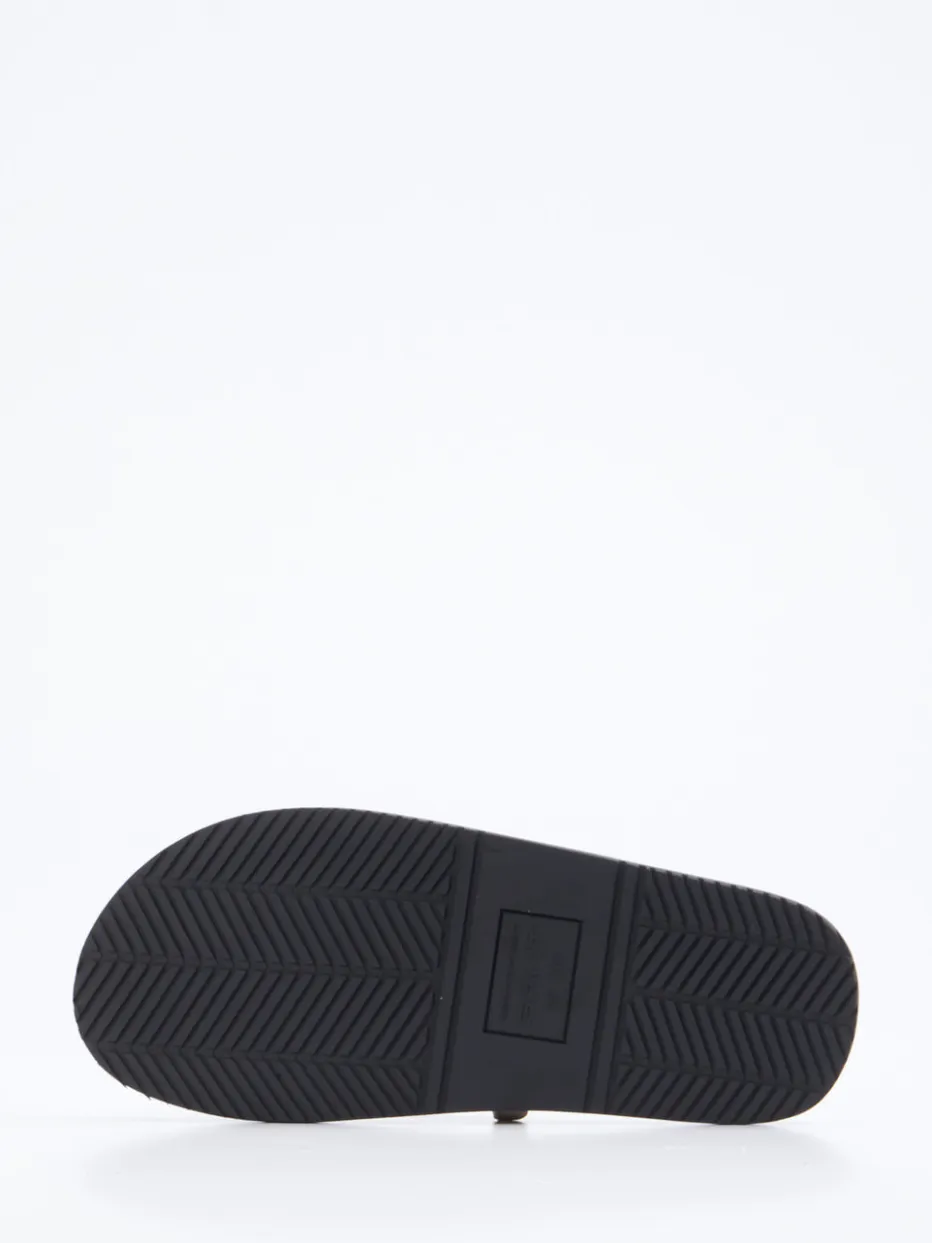 Die flache Silhouette mit strukturiertem, mattem Textilriemen sorgt für angenehmen Halt, während die dämpfende EVA-Sohle mit Gummi-Profil und zweifarbiger Zwischensohle sommerliche Flexibilität bietet. Schwarz dominiert den klaren Look, veredelt durch ein geprägtes Markenlogo auf Riemen und Fußbett. Inspiriert vom Streetwear- und Quiet-Luxury-Trend eignet sich das Modell ideal für entspannte Freizeitlooks und Urlaubsoutfits. Kombiniert mit Badeshorts oder Leinenhose entsteht ein zurückhaltend-edler Style.