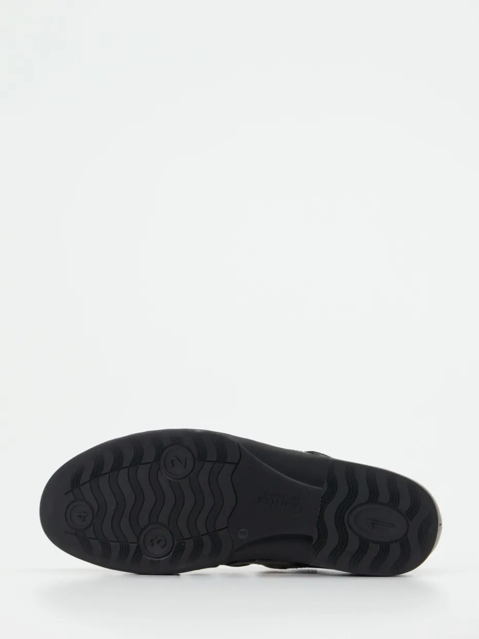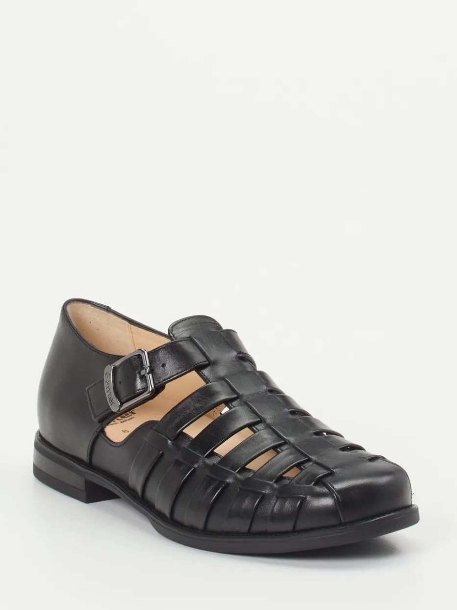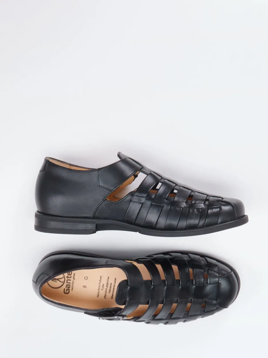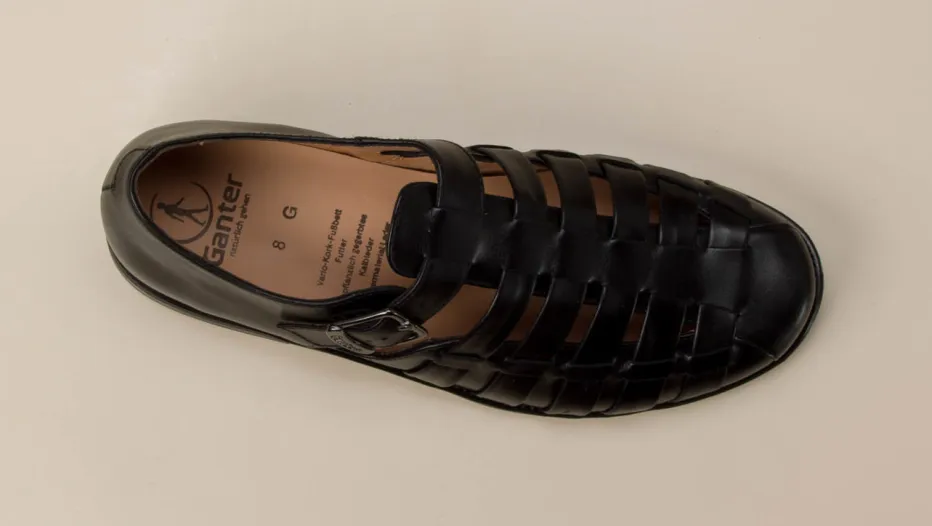 Luftig, funktional und zeitlos.Ganter präsentiert eine klassische Fisherman-Sandale für Herren. Ideal bei sommerlichen Temperaturen im Büro oder Alltag, verbindet dieses Modell Tragekomfort und eleganten Purismus. Gefertigt aus schwarzem Kalbleder mit glänzender Oberfläche und pflanzlicher Gerbung, setzt der Schuh auf ein robustes Design mit geschlossener Ferse und markanten Cut-Outs. Die silberfarbene Metallschnalle mit dezentem Logo ermöglicht individuellen Sitz. Innen überzeugt ein orthopädisch geformtes, herausnehmbares Vario-Kork-Fußbett, ergänzt durch eine exklusive 4-Punkt-Gummisohle. Stilistisch folgt der Look dem Trend „Quiet Luxury“ und passt besonders zu klassischen, komfortorientierten Outfits. Natürlicher Komfort mit dem Qualitätsversprechen von Ganter.