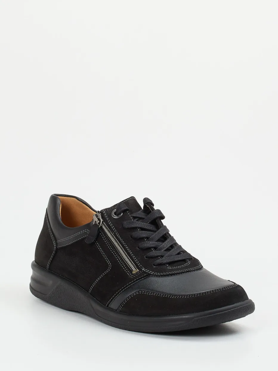 Für sensible Füße konzipiert, überzeugt der Schuh mit weichem Nubukleder, tonigem Stretchmaterial und samtig-matter Oberfläche. Das schwarz gehaltene Obermaterial wird durch graue Kontrastnähte strukturiert, während der praktische Seitreißverschluss und die elastische Schnürung müheloses An- und Ausziehen ermöglichen. Die extraleichte Gummisohle mit griffigem Profil sowie das lederbezogene, herausnehmbare Korkfußbett fördern ganztägigen Gehkomfort. Streetwear-inspiriert fügt sich das Modell nahtlos in minimalistische Alltagslooks ein – optimal zu Jeans und Softshell-Jacke kombinierbar.