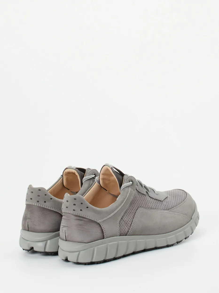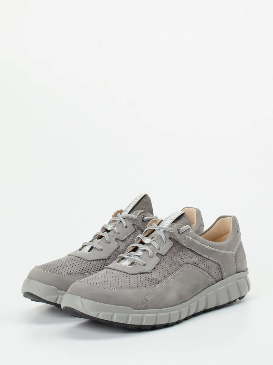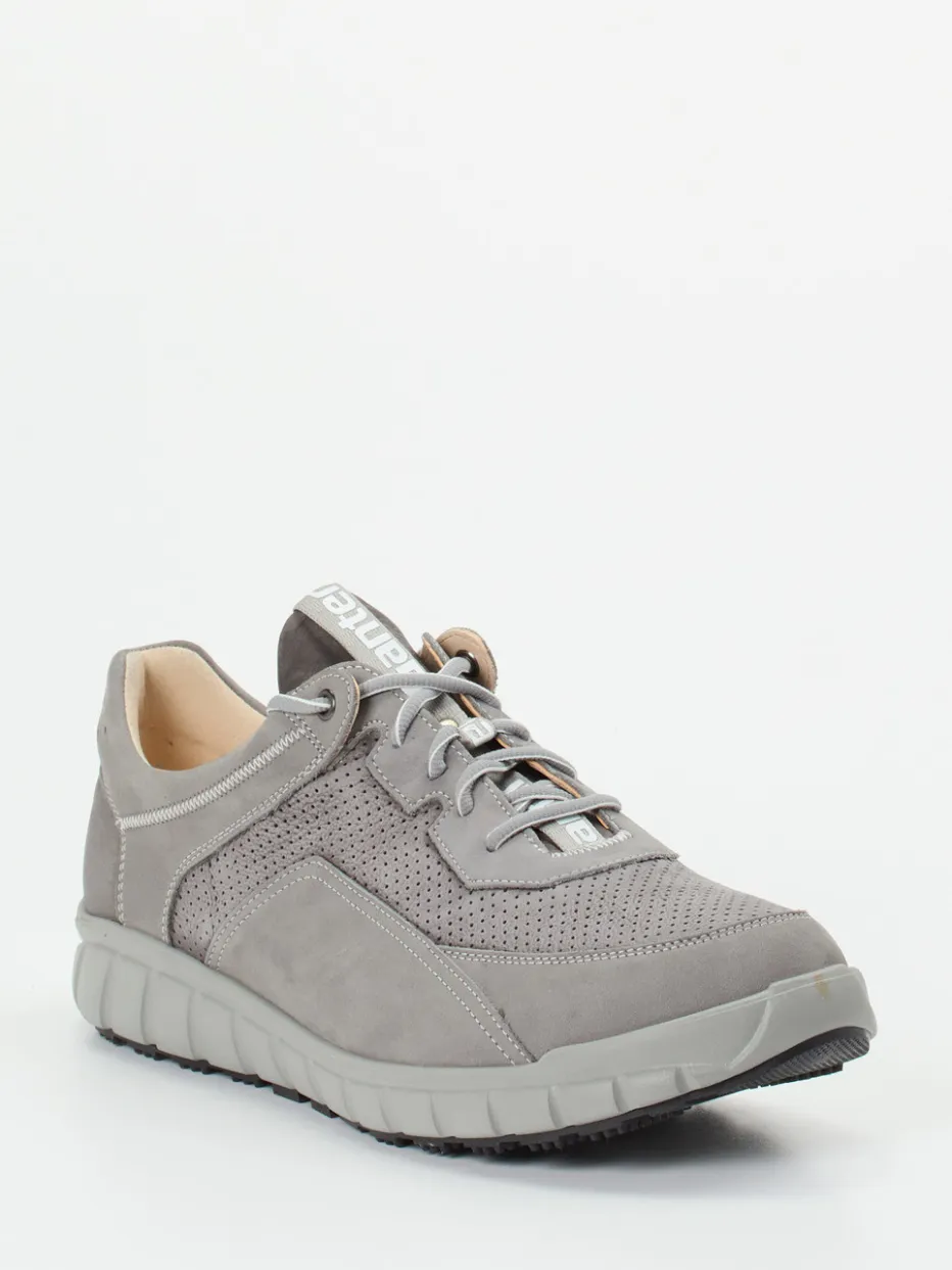 Schlicht, funktional und stilbewusst.Ganter präsentiert einen Herren-Sneaker aus der Komfortlinie, gefertigt für den aktiven Alltag und entspanntes Spazierengehen. Das graue Nubukleder wirkt samtig-matt und wird durch perforierte Partien für optimale Atmungsaktivität ergänzt. Die klassische, rund geschlossene Form und eine dezente Ton-in-Ton-Optik schaffen eine reduzierte Silhouette im minimalistischen Stil. Ein gepolsterter Schaftrand, griffige profilierte Sohle sowie reflektierendes Logo auf der Lasche unterstreichen die funktionale Ausrichtung. Dank individueller Schnürung sitzt der Schuh ideal – perfekt kombiniert zu Softshelljacken oder urbanen Casual-Outfits. Leichtgängiger Komfort in bewährter Ganter-Qualität – für einen souveränen Auftritt mit Entlastungspotenzial.