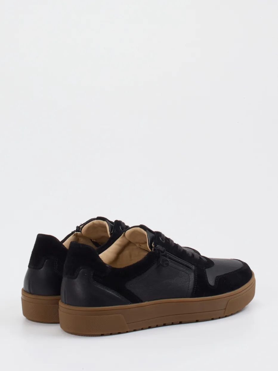 Stilvoller Komfort für moderne Herren.Ganter präsentiert mit diesem Sneaker eine cleane Freizeitwahl mit urbanem Anspruch. Ob Stadtbummel oder Bürotag – das Modell überzeugt mit einem Materialmix aus schwarzem, softem Nappaleder und samtig angerautem Veloursleder. Die leicht strukturierte Oberfläche unterstreicht den minimalistischen Charakter, während Reißverschluss und Schnürung Funktion vereinen. Die flexible, honigfarbene Gummisohle sorgt für angenehme Dämpfung, der gepolsterte Einstieg erhöht den Komfort zusätzlich. Kopf- und modisch klar denkende Männer schätzen diesen Schuh für seine Vielseitigkeit zwischen Streetwear-Einfluss und stiller Eleganz. Das bewährte Ganter-Fußbett steht für ergonomische Qualität mit Stil.