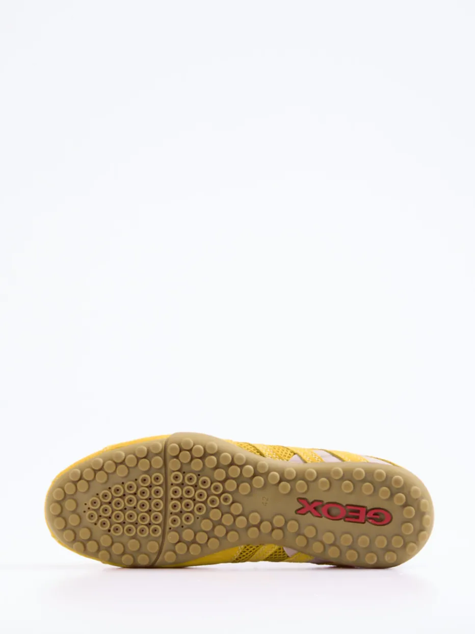 Retro trifft Funktionalität.Geox präsentiert diesen sportlichen Sneaker für Herren aus der Kategorie Low-Top. Ideal für wärmere Tage und aktive Stunden in der Stadt: Die atmungsaktive Mesh-Struktur und das samtig angeschliffene Veloursleder schaffen in Kombination ein angenehmes Trageklima. Auffällig tritt der Schuh in einem leuchtenden Sonnengelb auf, akzentuiert durch hellgraue und dunkelrote Details im Stil des Color-Blocking-Trends. Die flache Silhouette, gepolsterter Einstieg und die bekannte, luftdurchlässige GEOX-Gummisohle vereinen Komfort mit Retro-Sportswear-Ästhetik. Schnürverschluss und Textilfutter runden das Design ab. Ein stylisches Statement mit dem Komfortanspruch von Geox.