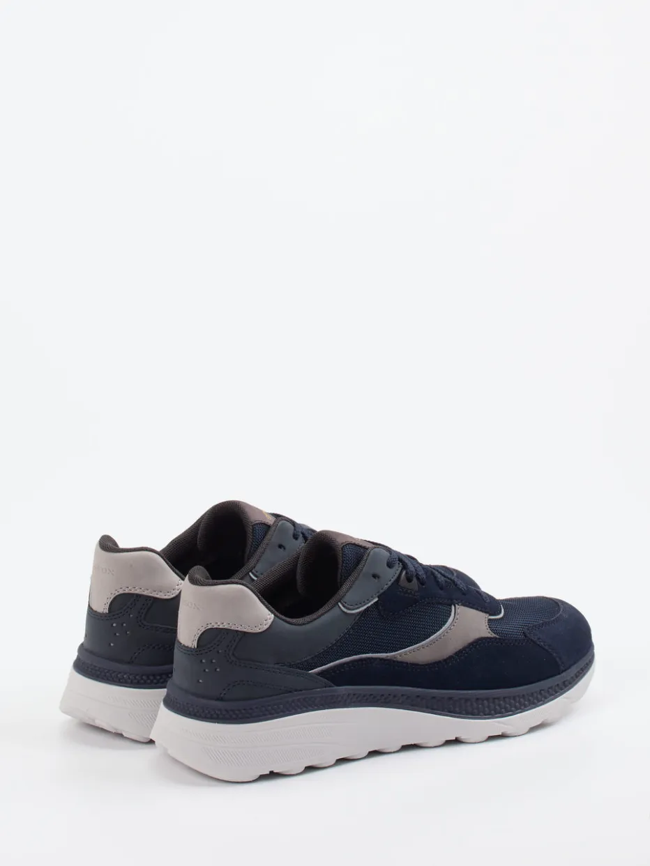 Komfort trifft sportliche Lässigkeit.Geox präsentiert einen Low-Top-Sneaker für Herren, der modern interpretierte Streetwear mit hohem Komfort verbindet. Ob für aktive Tage in der Stadt oder stilvolle Freizeitmomente – dieser Sneaker kombiniert atmungsaktives Mesh mit samtigem Veloursleder. Der Materialmix wird durch tonale Overlays und graue Kontrast-Details akzentuiert. Die dunkelblaue Farbgebung wirkt zeitlos, während die klassische, sportliche Silhouette und die profilierte Gummisohle sowohl Stabilität als auch Beweglichkeit garantieren. Gepolsterte Elemente sorgen zusätzlich für Bequemlichkeit. Ein stilvoller Begleiter für den Retro-Runner-Trend und urban-inspirierte Looks. Geox-typische Funktionalität vereint mit sportlich-eleganter Formsprache.