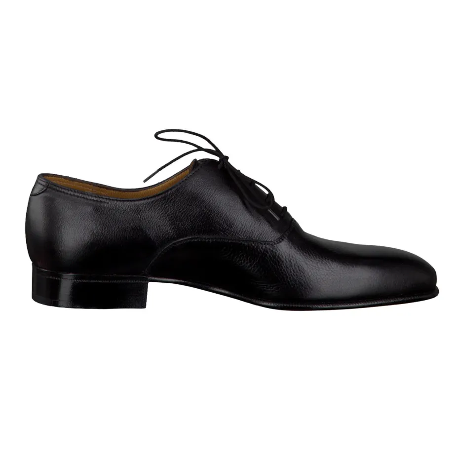 Gefertigt aus schwarzem Kalbleder mit genarbter, dezent glänzender Oberfläche, wirkt dieser Schnürschuh seriös und markant zugleich. Die schlanke, klassisch zulaufende Form wird durch eine fünfteilige Ösenschnürung und die durchgenähte Ledersohle betont. Goldgeprägtes Innenlogo und feine Fersennaht ergänzen die minimalistische Ästhetik. Als modisches Statement im Zeichen von „Quiet Luxury“ lässt sich der Oxford ideal zu Anzügen oder schmal geschnittenen Stoffhosen kombinieren.