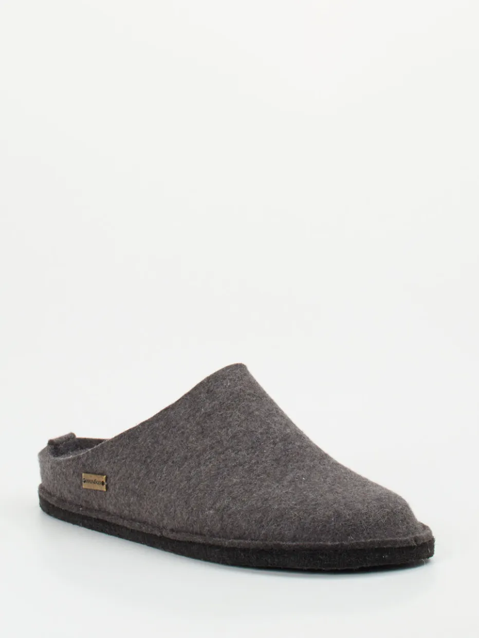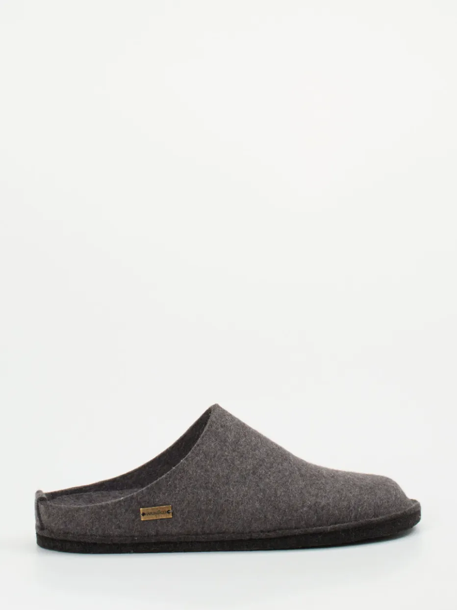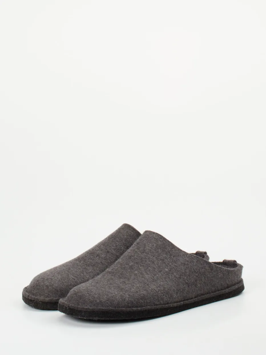 Das Modell aus dunkelgrauer, gewalkter Schurwolle überzeugt durch seine matte Oberfläche und eine atmungsaktive Struktur. Die geschlossene Vorderpartie trifft auf eine offen gestaltete Ferse – typisch für minimalistische Loungewear-Formen. Ein dezentes Markenlabel aus Metall und die gummierte, rutschhemmende Sohle unterstreichen die Alltagstauglichkeit. Ergonomisch und unisex geschnitten, passen sie besonders zu einem entspannten, nachhaltigen Wohnstil. In Kombination mit Wollsocken und weichem Loungewear-Outfit ideal.