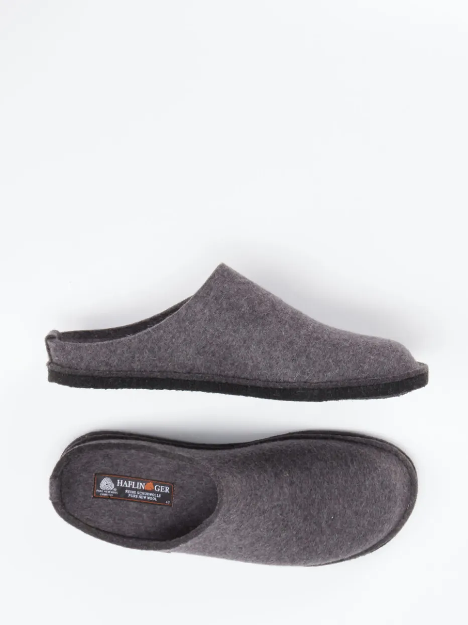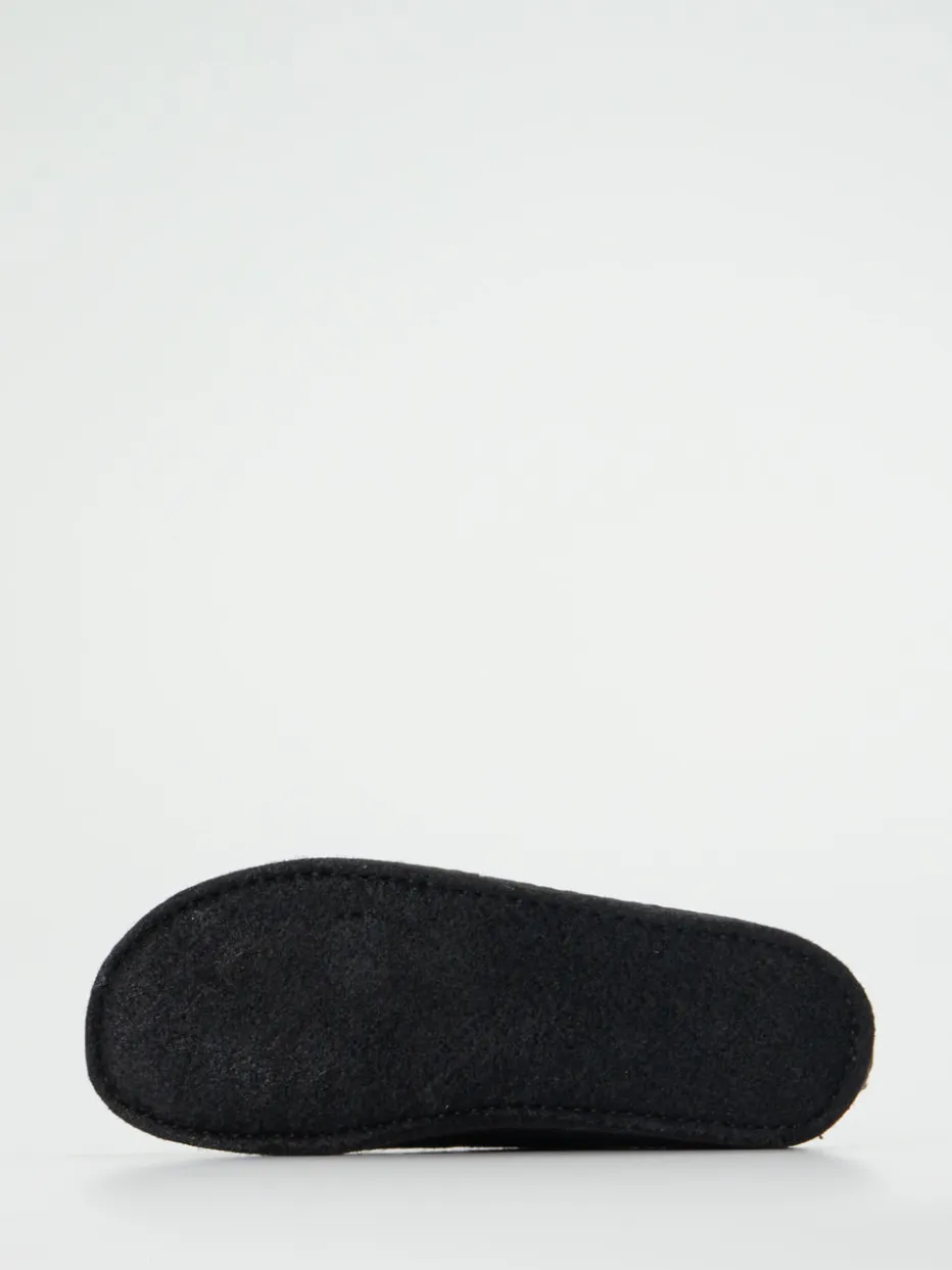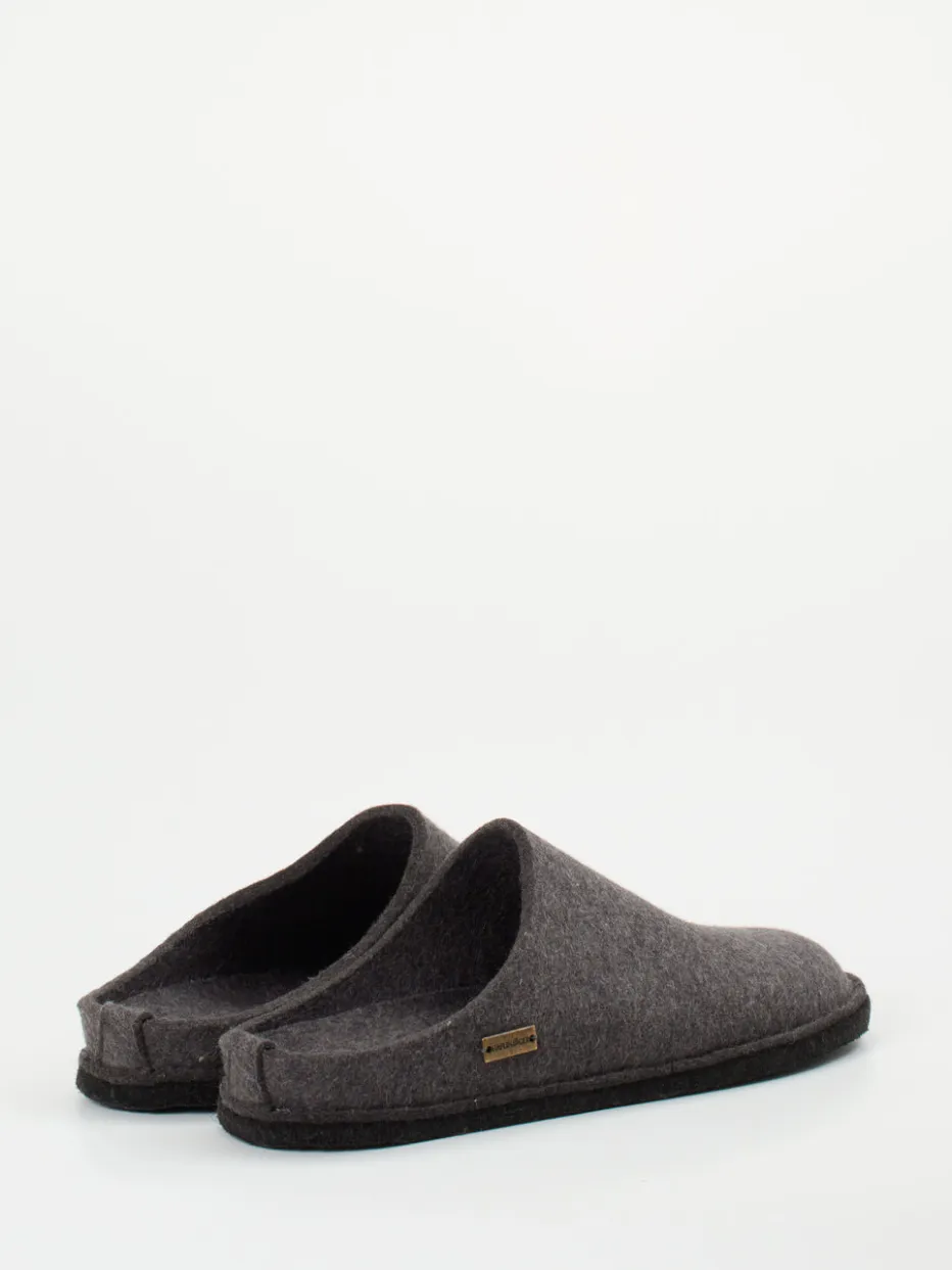 Das Modell aus dunkelgrauer, gewalkter Schurwolle überzeugt durch seine matte Oberfläche und eine atmungsaktive Struktur. Die geschlossene Vorderpartie trifft auf eine offen gestaltete Ferse – typisch für minimalistische Loungewear-Formen. Ein dezentes Markenlabel aus Metall und die gummierte, rutschhemmende Sohle unterstreichen die Alltagstauglichkeit. Ergonomisch und unisex geschnitten, passen sie besonders zu einem entspannten, nachhaltigen Wohnstil. In Kombination mit Wollsocken und weichem Loungewear-Outfit ideal.