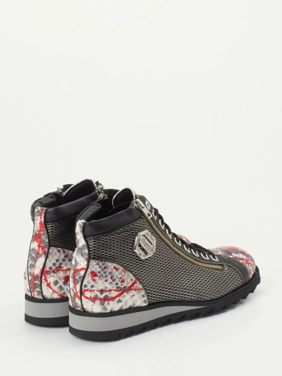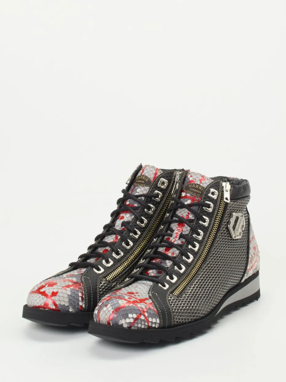Urbaner Style mit Reptil-Prägung.Die Marke Harris zeigt mit diesen Schnürboots eine ausdrucksstarke Variante des klassischen High-Top-Sneakers für Herren. Ideal für urbane Alltagsmomente oder als markanter Akzent bei abendlichen Ausgeh-Looks: Dank geprägtem Leder mit Schlangenstruktur, Mesh-Elementen und goldfarbenem Reißverschluss verbindet das Modell markante Optik mit funktionaler Raffinesse. Die Kombination aus Dunkelgrau, Rot und Hellgrau unterstreicht die expressiv-maskuline Silhouette. Zwei seitliche Zipper und ein gepolsterter Schaft bieten hohen Tragekomfort. Die profilierte Gummisohle trägt den Outdoor-Charakter in sich, während die Statement-Optik im Streetstyle verankert ist. Perfekt zu Bikerjacke und grauer Jeans. Ein Modell, das Designstärke, Funktion und modische Relevanz souverän vereint.