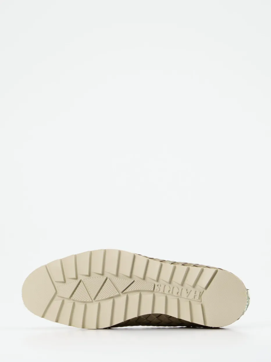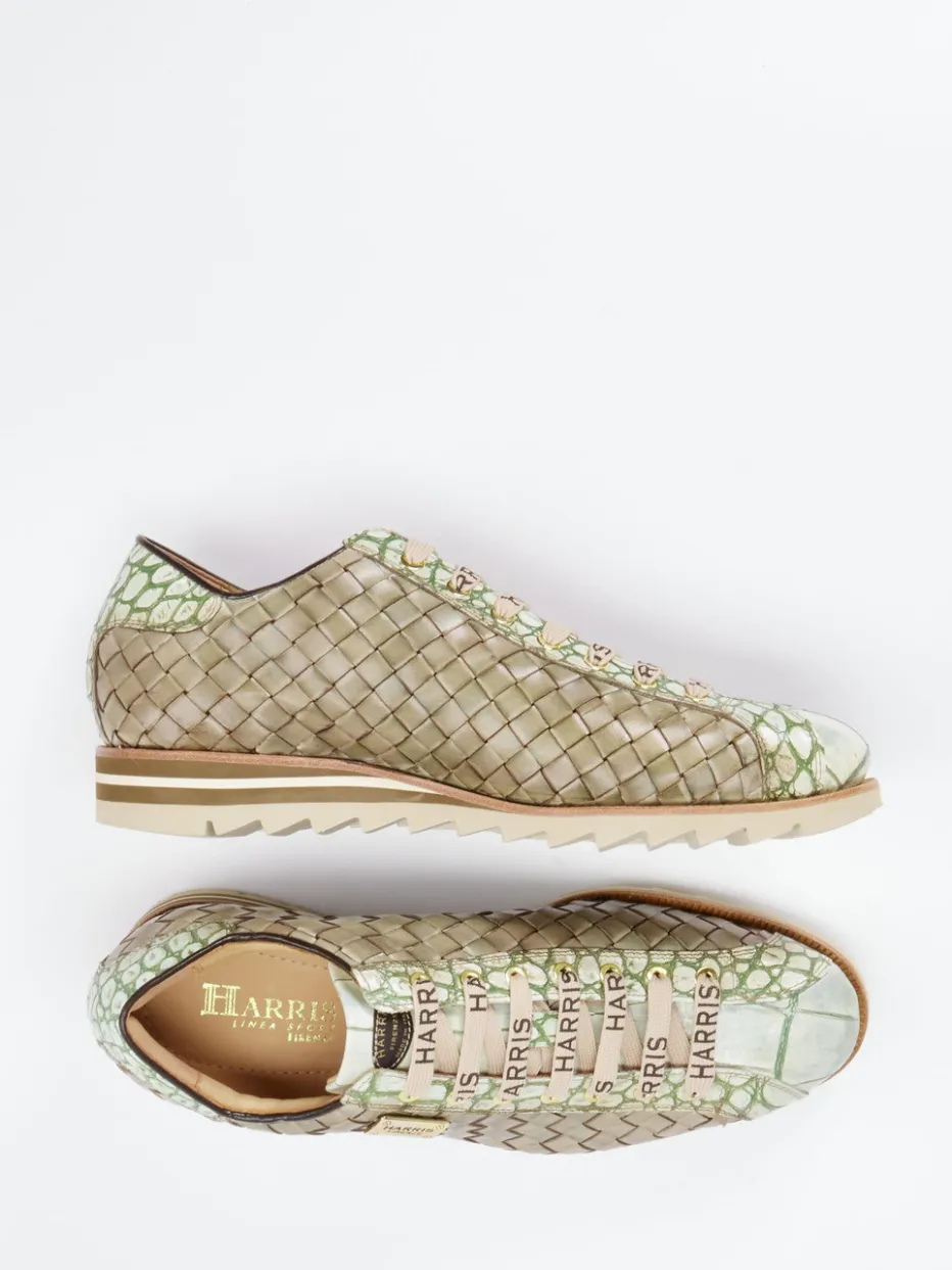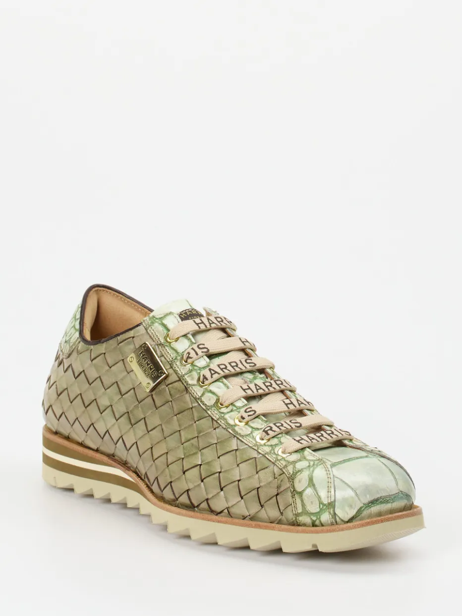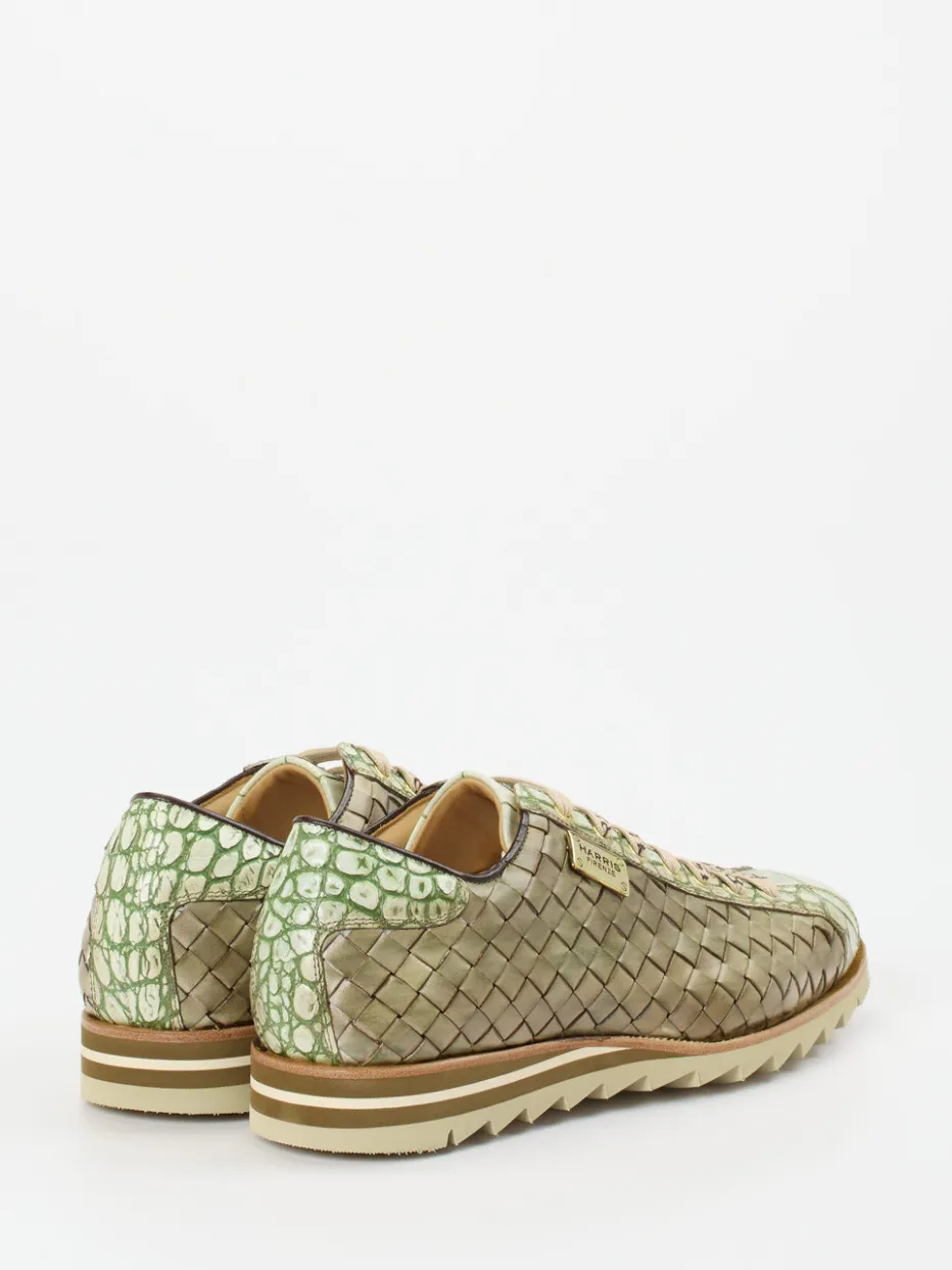 Material trifft Stilgefühl.Harris zeigt mit diesem Herren-Sneaker eine exklusive Interpretation urbaner Eleganz. Perfekt für entspannte City-Momente mit modischem Anspruch: Gefertigt aus hochwertigem Flechtleder mit glänzender Oberfläche überzeugt das Modell in einem edlen Salbeigrün. Die Kombination aus geflochtener Struktur und reptilgeprägtem Mittelstreifen verleiht dem Schuh Tiefe und Charakter; goldfarbene Ösen sowie Logoelemente an der Schnürung unterstreichen den Luxusanspruch. Die markante Profilsohle mit Zackenstruktur sorgt für Stabilität und ein kraftvolles Finish. Inspiriert vom Trend „Quiet Luxury“ ergänzt dieser Sneaker stilvoll casual-elegante Kombinationen – etwa mit Chino oder leichter Bomberjacke. Harris steht hier für unverkennbaren Komfort und italienische Raffinesse in jedem Detail.