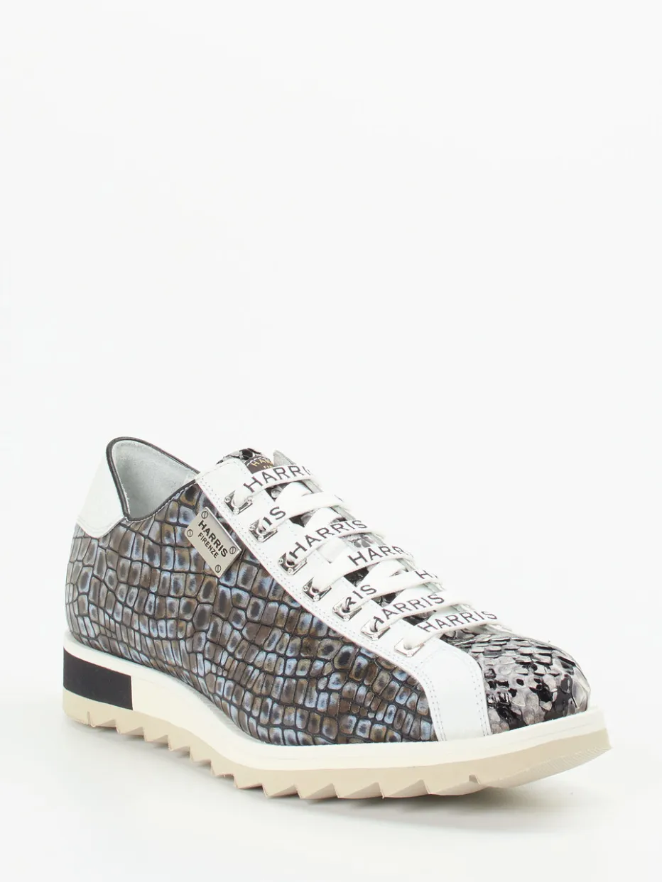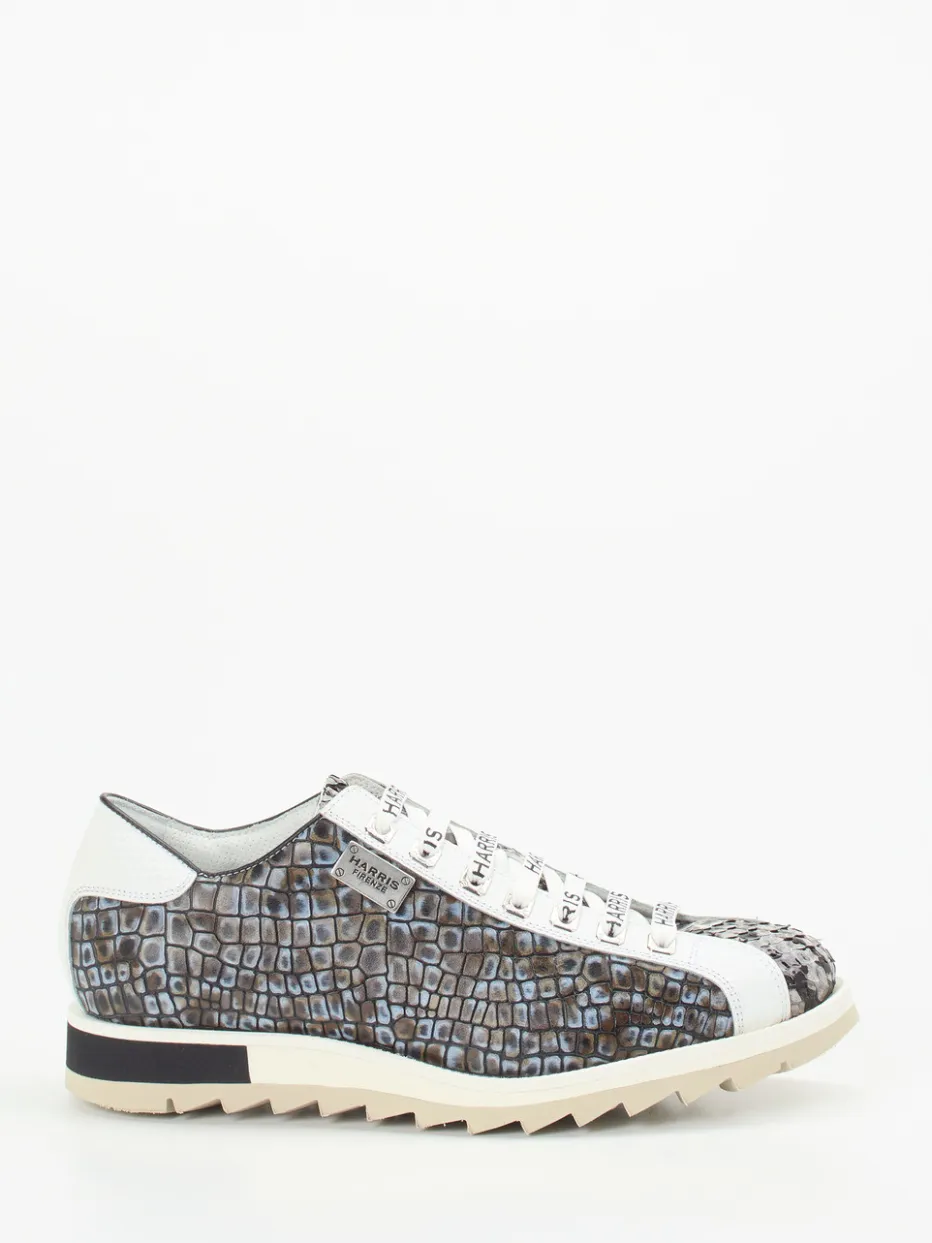 Dieser Herren-Sneaker verbindet glänzendes geprägtes Leder in Kroko-Optik mit sportivem Schnitt und luxuriösen Streetstyle-Elementen – ein echtes Statement für urbane Looks.
