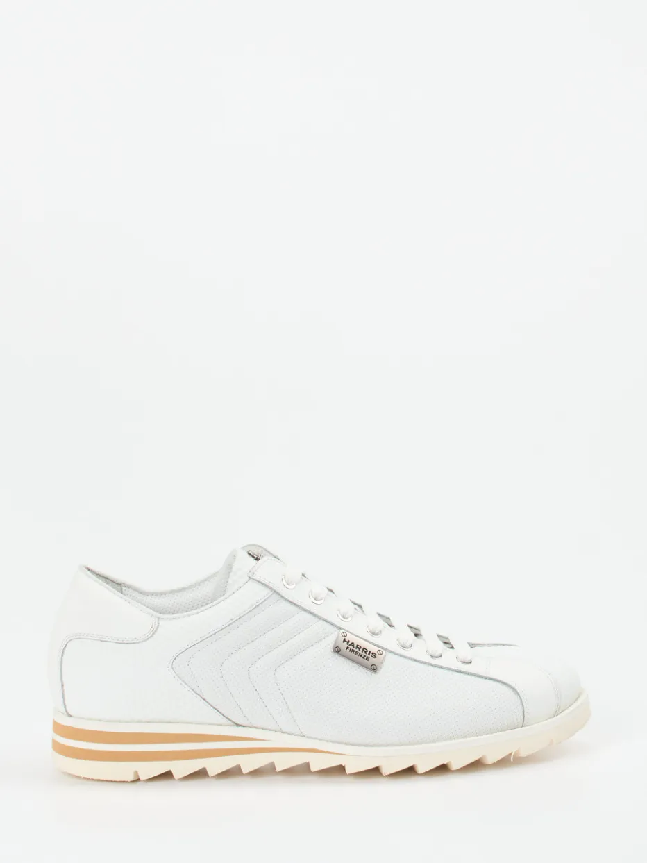 Stilkontrast mit Struktur.Dieser Herren-Sneaker von Harris verbindet klassische Eleganz mit sportlicher Formsprache. Wer im Alltag wie im Büro ein stilsicheres Statement setzen möchte, trifft mit diesem Modell eine durchdachte Wahl. Das Obermaterial aus hochwertigem, geprägtem Kalbleder wird durch Mesh-Einsätze mit dezenter Narbung ergänzt. Weiß dominiert das klare Design, während Sand- und Beigetöne subtile Kontraste über Schnürsenkel, Metallösen und eine zweifarbige Gummisohle mit Retro-Streifendetails setzen. Die flache, formstabile Silhouette mit Haifischprofil unterstreicht die Retro Runner-Ästhetik – ideal für minimalistische Looks mit weißer Chino oder sommerlicher Jacke. Komfort und Präzision in exklusivem Materialmix – typisch Harris.