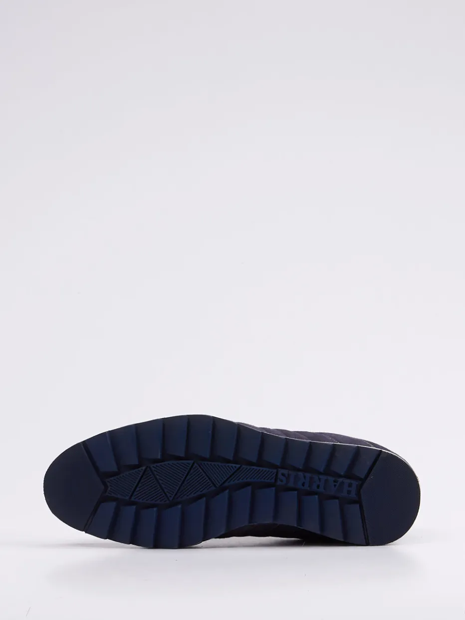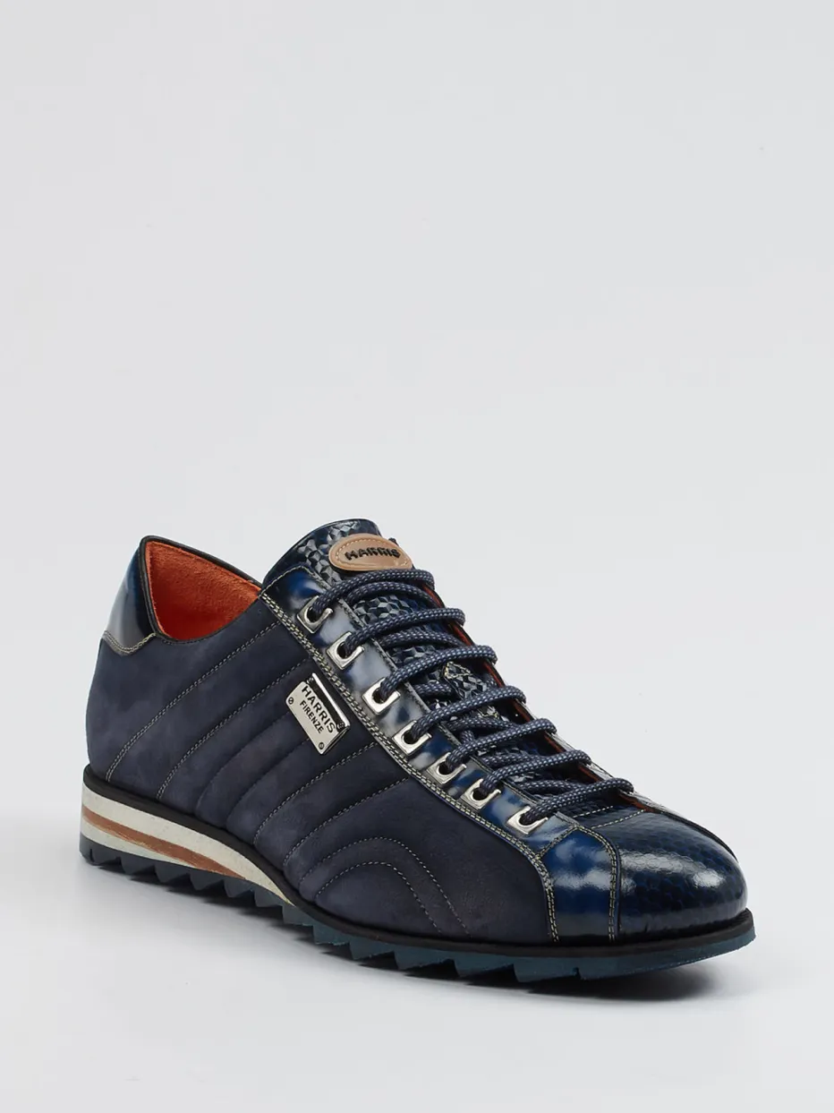 Retro-Update für urbane Looks.Die Marke Harris präsentiert mit diesem Sneaker für Herren ein Modell für stilbewusste Freizeitmomente. Der hochwertige Materialmix aus samtigem Veloursleder und partiell geprägtem Glattleder mit Reptilstruktur verleiht dem Sneaker optische Tiefe. Die Kombination aus Nachtblau mit signalorangem Innenfutter sorgt für starke Kontraste, während die klassische, schmale Silhouette sportlich bleibt. Die profilierte Gummisohle und der gepolsterte Einstieg bieten Komfort, inspiriert von Retro-Running-Stilen. Mit Schnürung und metallischem Label ergänzt sich das Design souverän. Ein markanter Freizeitschuh mit italienischem Esprit und handwerklichem Anspruch.