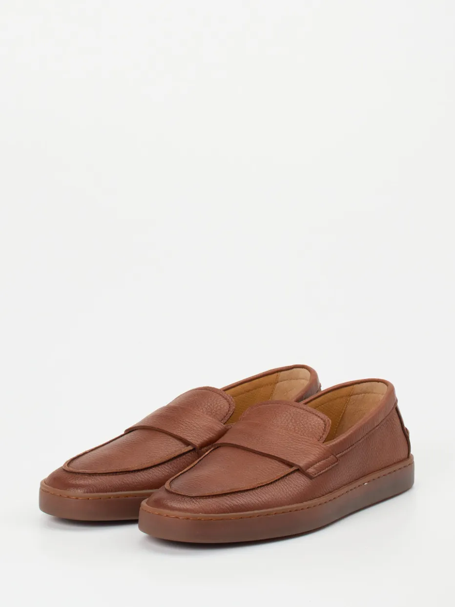 Puristischer Komfort für stilvolle Tage.Henderson präsentiert mit diesem Loafer ein Herrenmodell für Business und Freizeit. Ob im Büro oder beim Stadtbummel – dieser klassische Slipper sorgt für souveräne Auftritte. Das mittelbraune Hirschleder mit natürlicher Narbung liegt angenehm am Fuß und wirkt dabei besonders edel. Die flache Silhouette, ein ledergefüttertes Innenleben und das gepolsterte Wechselfußbett bieten hohen Komfort, während die fein strukturierte Gummisohle Sicherheit gibt. Durch die schlanke Form und das tonale Design lässt sich der Schuh ideal mit Chinos oder Stoffhose kombinieren – perfekt für den Smart-Casual-Stil. Handverarbeitet mit italienischer Präzision – ein Modell mit Understatement und Substanz.