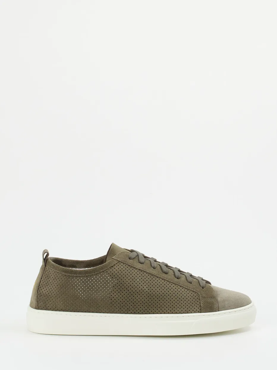 Minimalistische Raffinesse für urbane Looks.Henderson interpretiert den klassischen Herren-Sneaker neu – mit olivgrünem Veloursleder in perforierter Ausführung und einer cleanen, weißen Gummisohle. Ideal für Büro oder Freizeit, bietet das Modell luftig strukturiertes Leder mit matter Oberfläche und goldfarbenem Logodetail an der Ferse. Die flache Silhouette mit Schnürung und Zuglasche passt perfekt zu Chinohosen und monochromen Outfits. Streetwear-Einflüsse vereinen sich mit reduziertem Design zur zeitlosen „Quiet Luxury“-Anmutung. Mit herausnehmbarem Fußbett und rutschhemmender Sohle überzeugt dieser Sneaker durch Komfort und Understatement.