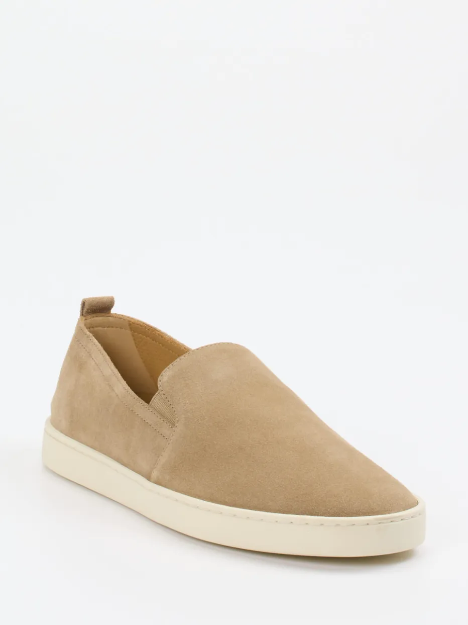 Minimalismus trifft Handwerk.Henderson präsentiert mit diesem Herren-Slipper einen legeren Slip-On Sneaker im modern-reduzierten Stil. Für sommerliche Spaziergänge oder stilvolle City-Tage bietet das Modell Komfort und Eleganz zugleich. Das samtig angeschliffene Veloursleder in sandfarbenem Braun verleiht eine dezente Struktur, während die helle Gummisohle für Flexibilität und Leichtigkeit sorgt. Die flach zulaufende Silhouette mit elastischen Einsätzen und dezenter Logo-Prägung unterstreicht den minimalistischen Look. Inspiriert von „Quiet Luxury“ und „Soft Neutrals“, passt der Schuh perfekt zu natürlichen Farbtönen und entspannten Casual-Outfits. Hochwertig handgefertigt in Italien – für stilbewusste Herren mit Anspruch.