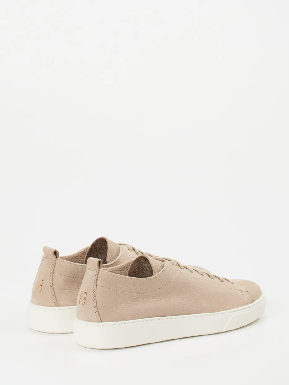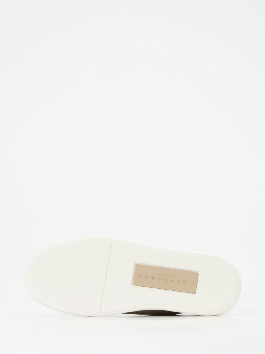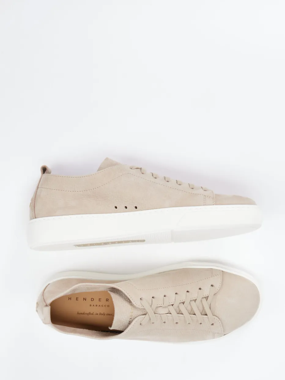 Minimalismus in Perfektion.Henderson präsentiert mit diesem Low-Top-Sneaker ein stilvolles Herrenmodell in feinem Nubukleder. Ideal für urbane Szenen oder den Weg ins Büro beweist das beigefarbene, samtig genarbte Leder Gespür für dezente Eleganz. Die flache Silhouette mit tonalen Nähten, weißer Gummisohle und geprägtem Fersenlogo unterstreicht das ruhige Design. Dank Schnürung und Zuglasche gelingt der Einstieg mühelos. Kombinationsstark zur Chino oder Denim – ein Modell ganz im Zeichen cleanen Luxusbewusstseins. Unaufdringlich modern mit italienischer Handwerksqualität.