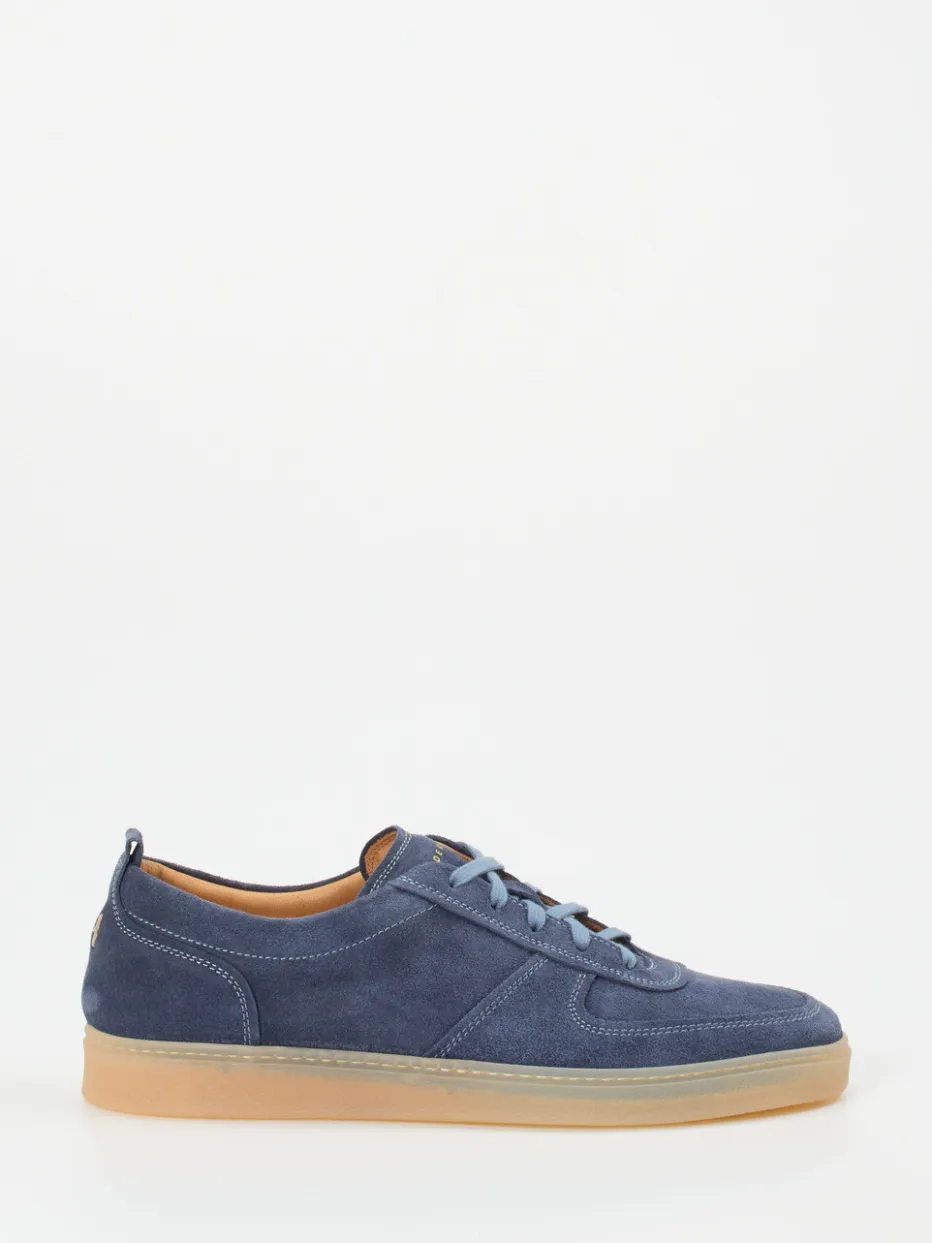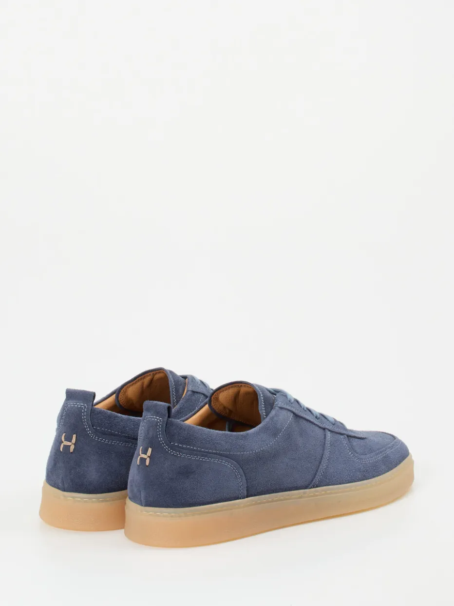 Stilvoller Minimalismus trifft Retro-Vibes.Henderson zeigt mit diesem Herren-Sneaker ein elegant reduziertes Modell für Alltag und Office. Der Low-Top aus hochwertigem blaugrauem Veloursleder mit matter Oberfläche überzeugt durch seine klassische, flache Silhouette und eine betont dezente Formsprache. Farbliche Akzente setzen die hellere Schnürung und die hellbraune Gummisohle mit Fischgrätprofil. Innen sorgt softes Kalblederfutter für Komfort, unterstützt von einem gepolsterten Wechselfußbett. Durch das geprägte Logo an der Ferse erhält das Design einen subtilen Markenverweis. Ideal passend zum Quiet-Luxury-Trend und ein souveräner Begleiter zu Chinos oder Denim. Handgefertigte Qualität mit Understatement von Henderson.