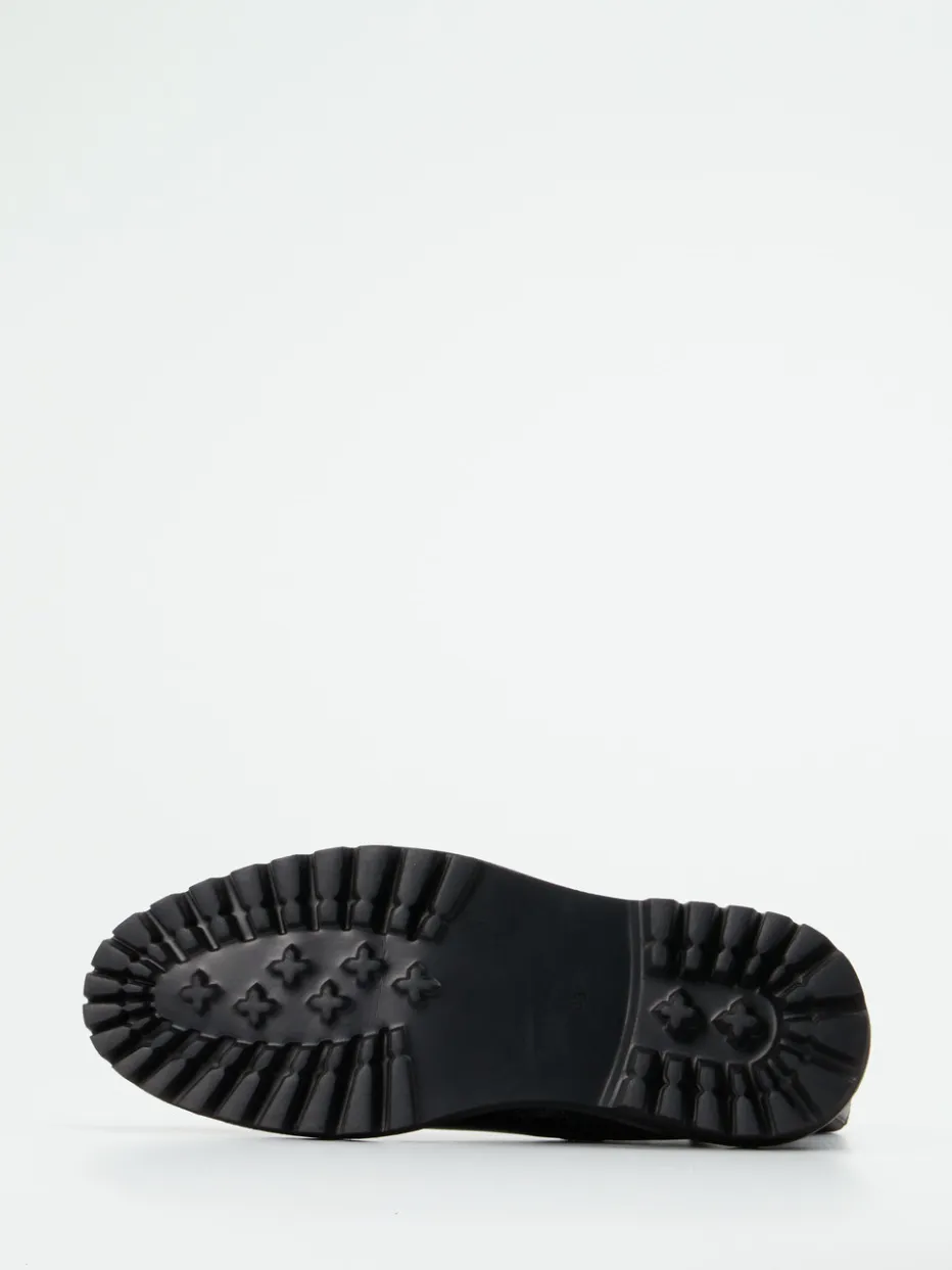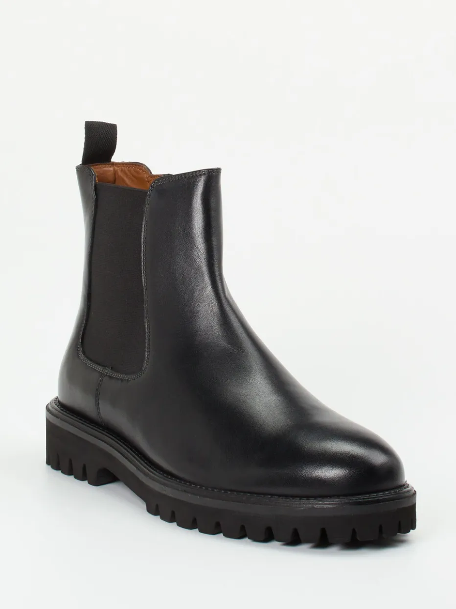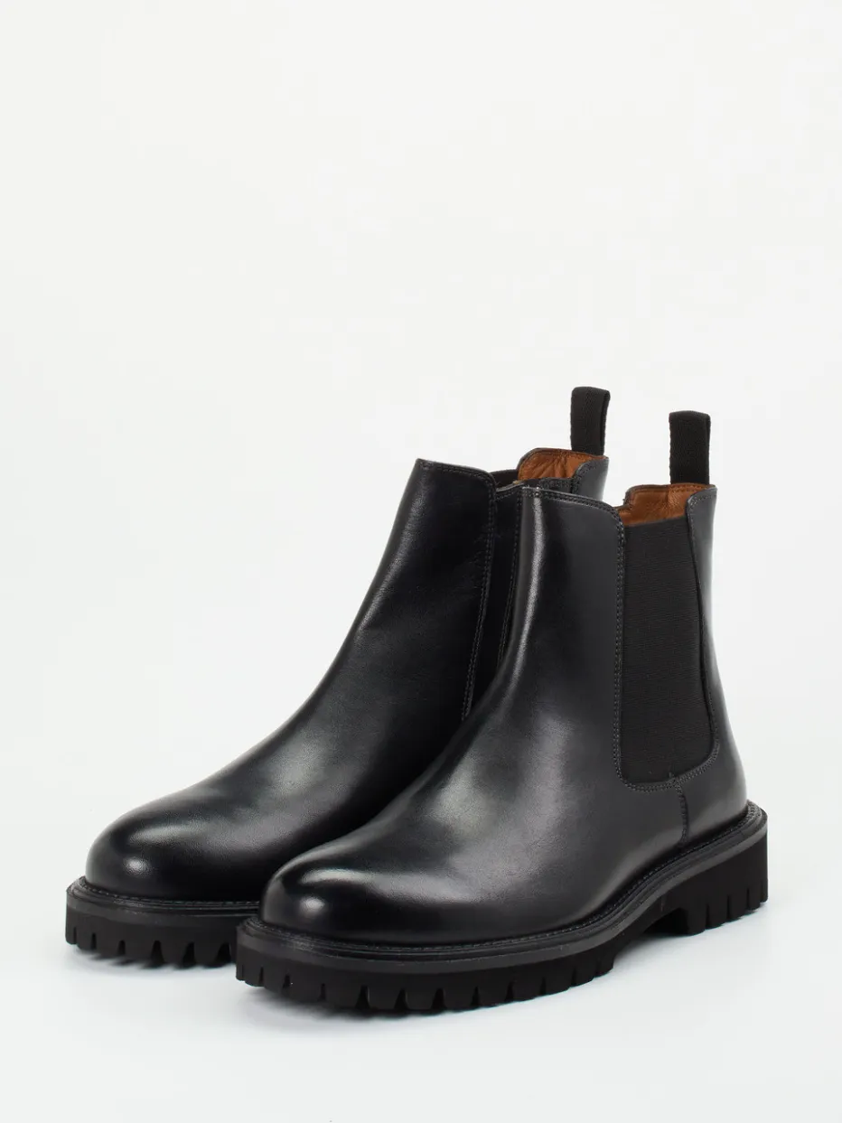 Schwarzes Kalbleder in glänzender Optik trifft auf eine profilierte Gummisohle und reduziert-modernen Look. Funktional ergänzt durch Reißverschluss und Elastikelemente.