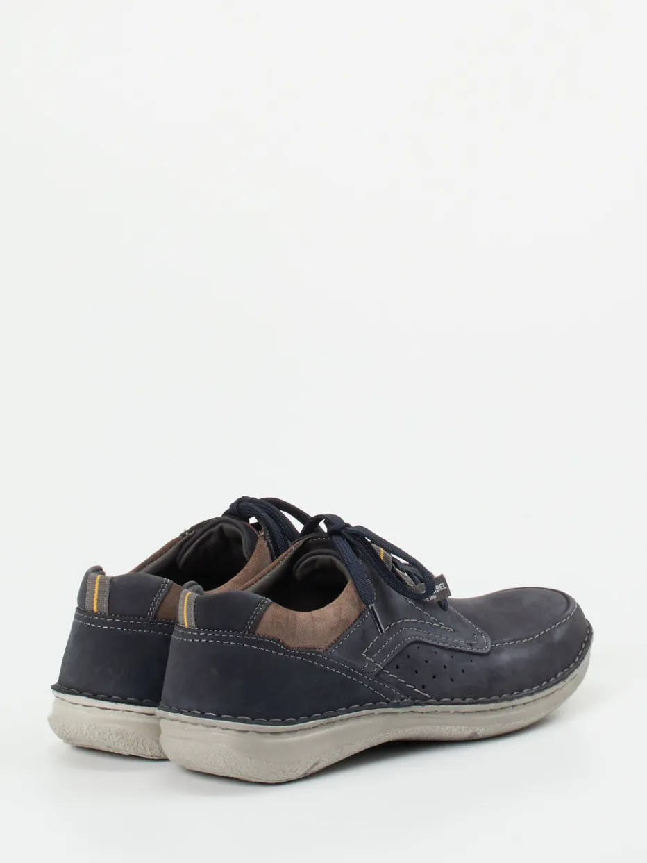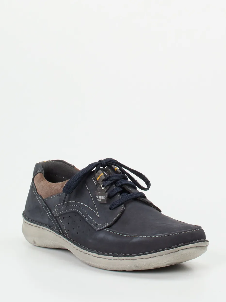 Alltag neu erleben – mit Stil und Komfort.Josef Seibel präsentiert einen Herren-Komfortschuh der Kategorie Schnürhalbschuhe. Wenn entspanntes Gehen im Alltag Priorität hat, überzeugt dieser Halbschuh durch seine großzügige Passform und das soft angeschliffene Nubukleder in Dunkelblau. Kontrastnähte, Veloursakzente an der Ferse und die rund geformte Silhouette unterstützen den lässigen Charakter. Die griffige Gummiprofilsohle sorgt für festen Tritt, während der gepolsterte Einstieg den Fuß sanft umschließt. Ideal für casual-orientierte Looks mit Jeans oder Chinos. Verlässlicher Komfort von Josef Seibel für einen souveränen Freizeitauftritt.