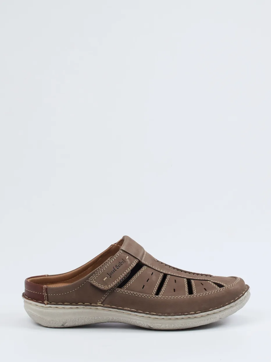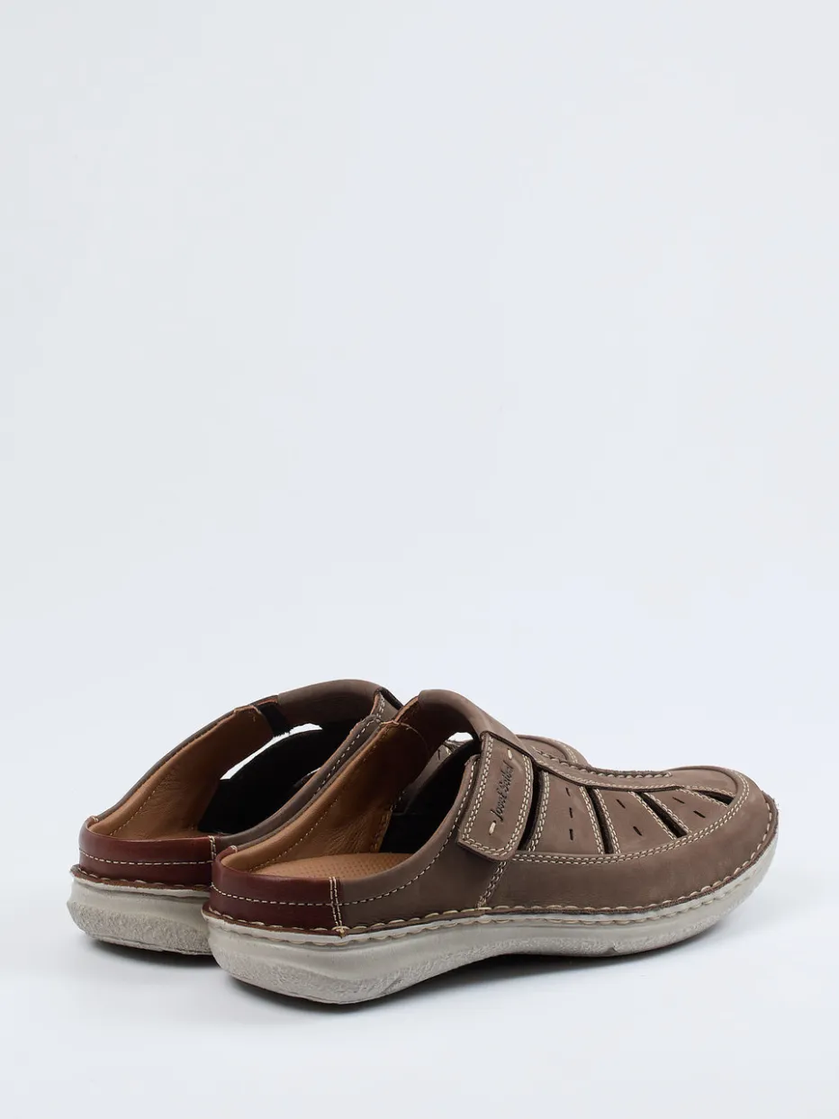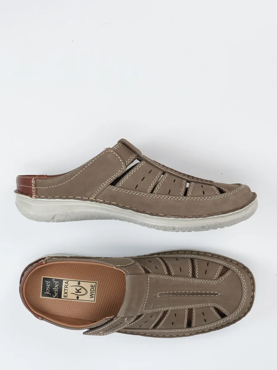Josef Seibel bringt mit dieser Komfort-Pantolette ein entspanntes Herrenmodell für jeden Tag. Ideal für entspannte Momente zu Hause oder bei sommerlichen Stadtgängen bietet sie besonderen Komfort durch ihre extraweite Passform. Graues, samtig angeschliffenes Nubukleder wird durch helle Kontrastnähte sowie Cut-Out-Zierstreifen aufgelockert. Die geschlossene Frontpartie sorgt für Halt, während die offene Ferse bequemes Hineinschlüpfen ermöglicht. Eine weich gepolsterte, optionale Einlagensohle und die rutschhemmende graue Gummisohle unterstreichen den funktionalen Charakter. Passt perfekt zu Casual-Hose und Kurzarmhemd.