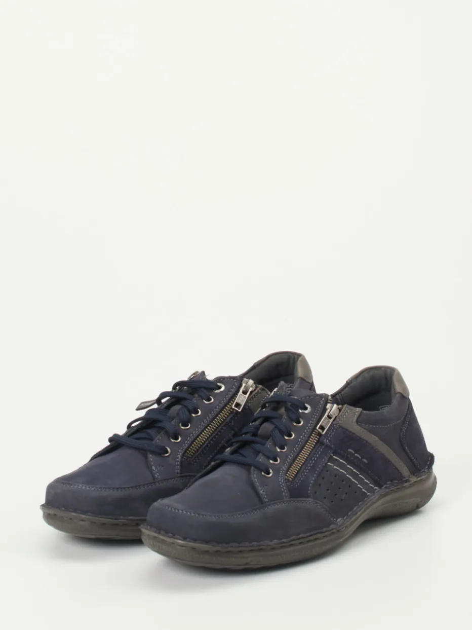 Schrittweise Entspannung für den Alltag.Josef Seibel präsentiert einen Komfort-Schnürschuh für Herren mit besonders bequemer Passform. Ob Stadtspaziergang oder entspannte Tätigkeiten – der dunkelblaue Schuh mit hochwertigem Nubukleder und samtig-matter Oberfläche sorgt für ein angenehmes Tragegefühl. Die klassische, flache Silhouette wird von seitlichen Reißverschlüssen und dezenten Kontrastnähten stilvoll ergänzt. Eine leichte Gummisohle bietet Trittsicherheit, während das weiche Textilfutter und die herausnehmbare Innensohle für Komfort sorgen. Perfekt kombinierbar mit Stretch-Jeans und Casualwear. Zuverlässige Funktionalität trifft dezente Designmerkmale – typisch Josef Seibel.