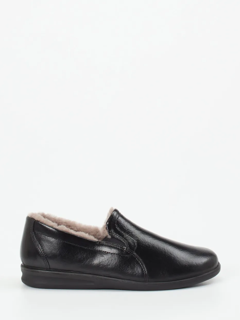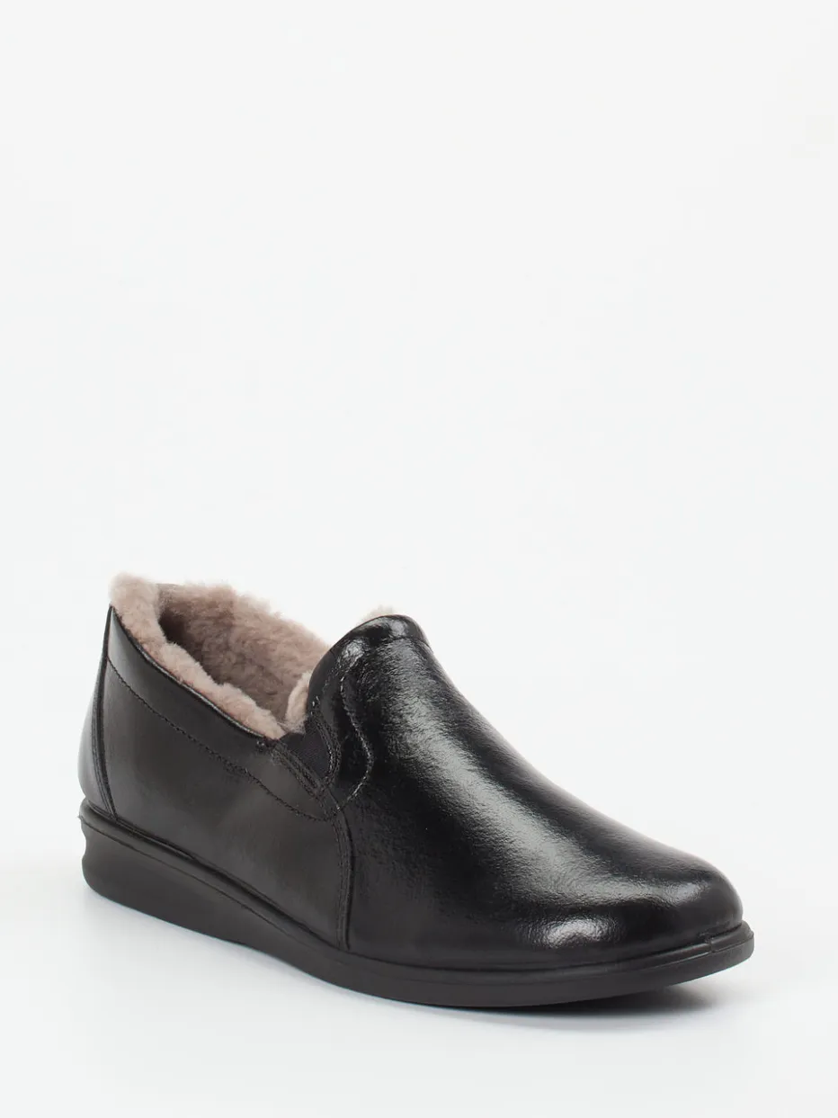 Ein geschlossener Hausschuh aus weichem Kalbleder mit glänzender Oberfläche und komplette Fütterung aus Lammfell – ideal für gemütliche Momente an kalten Tagen.