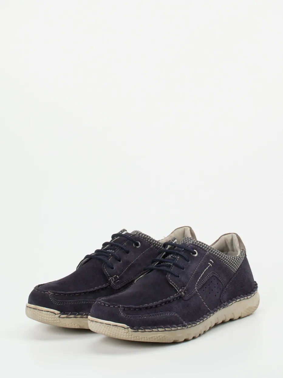 Komfort neu definiert.Josef Seibel präsentiert mit diesem Freizeitschuh einen Herren-Schnürer für Alltag und Freizeit. Ein angenehm weicher Schaftrand, das atmungsaktive Futter und die gepolsterte Zunge bieten ganztätigen Tragekomfort. Dunkelblaues Veloursleder, samtig angeschliffen, prägt gemeinsam mit Kontrastnähten und Textilbesatz die sportlich-klassische Optik. Die flache Silhouette, die Gummisohle mit Profil und der verstärkte Fersenbereich unterstreichen funktionale Alltagstauglichkeit. Modisch liegt das Modell im Trendsegment „Everyday Utility“. Einlegesohlen können bei Bedarf ausgetauscht werden. Ein Schuh mit spürbarer Bewegungsfreiheit und stilvoller Leichtigkeit.
