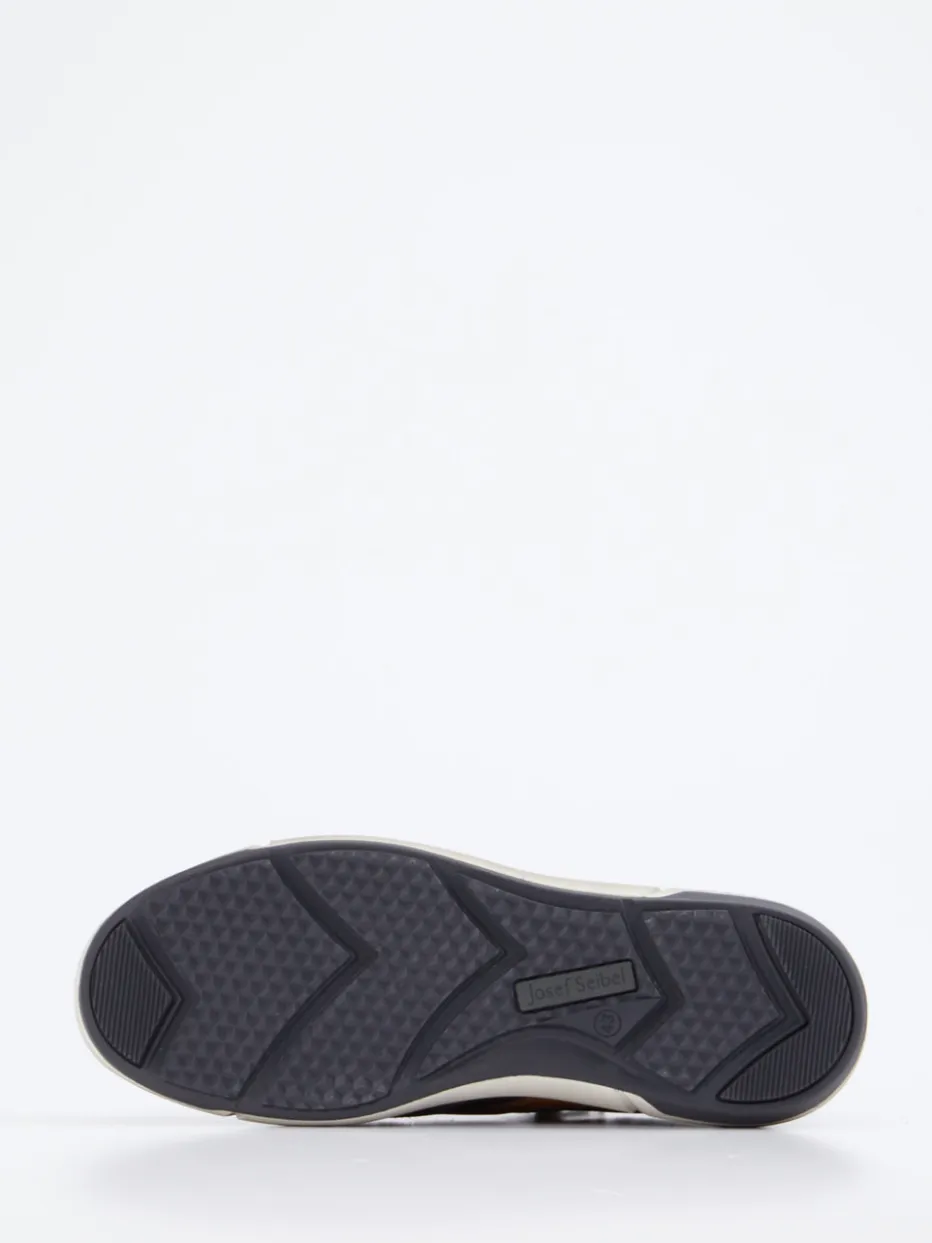 Der Schnürsneaker Enrico 20 von Josef Seibel vereint klassischen Stil und moderne Alltagstauglichkeit. Ob bei langen Bürozeiten oder entspanntem Stadtspaziergang – das hochwertig gearbeitete Nubukleder wirkt samtig matt und sorgt gemeinsam mit der cognacfarbenen Fersenkappe für stilvolle Akzente. Die Kombination aus Schnürung und funktionalem Reißverschluss erleichtert das An- und Ausziehen, während das weich gepolsterte Wechselfußbett individuellen Komfort bietet. Die flache Silhouette und rutschhemmende Gummisohle unterstreichen den lässig-urbanen Charakter, unterstützt durch dezente Kontrastnähte und eine geprägte Logodetail. Ein zuverlässiger Begleiter für komfortbewusste Casual-Looks mit feiner, zurückhaltender Optik.