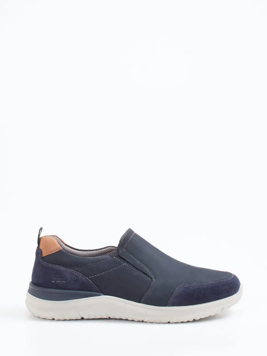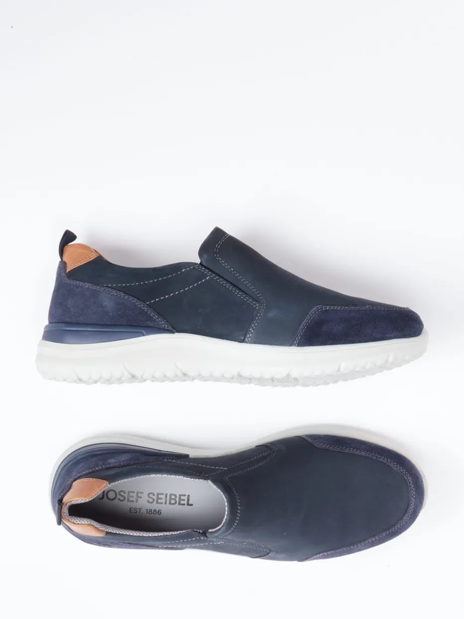 Komfort trifft Design.Josef Seibel präsentiert einen bequemen Herren-Slipper in runder Slip-On-Form mit ergonomischer Silhouette. Ideal für Freizeit, Reisen oder entspannte Tage: Das Modell besteht aus samtig angeschliffenem Nubukleder in Dunkelblau, kombiniert mit Kontrastdetails in Hellbraun und Grau. Elastische Einsätze und eine gepolsterte Gummisohle sorgen für hohen Komfort bei langen Laufwegen. Das atmungsaktive Mesh-Innenfutter unterstützt ein angenehmes Fußklima. Die ziehfreundliche Zuglasche und das zurückhaltende Design orientieren sich an minimalistischen Streetwear-Trends. Ein pflegeleichter Begleiter mit lässigem Look für moderne Komfortansprüche.