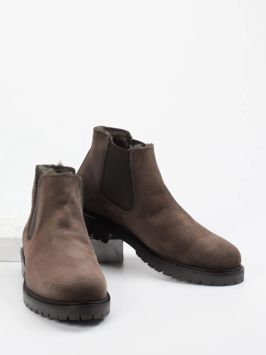 Authentischer Look, funktional veredelt.Konstantin Starke präsentiert hochwertige Chelsea Boots für Herren. Für urbane Wintertage mit Stilanspruch bietet dieses Modell zuverlässige Wärme und Eleganz. Das braune Veloursleder in matter Ausführung wirkt edel und zurückhaltend, während tonale Elastikeinsätze und ein geprägtes Logo dezent Akzente setzen. Die knöchelhohe Form mit Lammfellfutter und rutschfester Profilgummisohle verbindet Komfort mit Funktion – von Büro bis Freizeit. Inspiriert von Quiet Luxury und Heritage-Design, lässt sich der Look mühelos zu Wollmantel und Kaschmir kombinieren. Ein Alltagsbegleiter mit klarer Linie und hoher Verlässlichkeit.