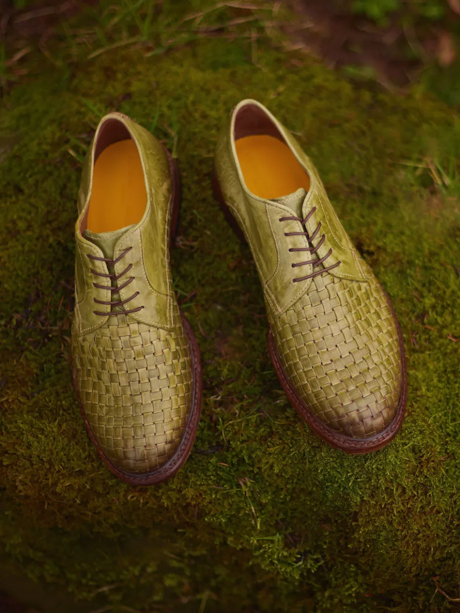 Im Büroalltag oder bei sommerlichen Freizeit-Anlässen überzeugt das Modell durch olivgrünes, glänzendes Flechtleder – fachmännisch verarbeitet mit sichtbaren Steppnähten und angenehm weichem Kalblederfutter. Die klassische Rundsilhouette mit 5-Loch-Schnürung und natürlichem Kontrastabsatz sorgt für souveräne Präsenz. Eine Ledersohle mit Gummieinsätzen sichert Halt auf urbanem Terrain. Stilistisch greift der Schuh aktuelle SS24-Trends wie Natural Tones und strukturierte Materialien auf und passt hervorragend zu hellen Leinenhosen.