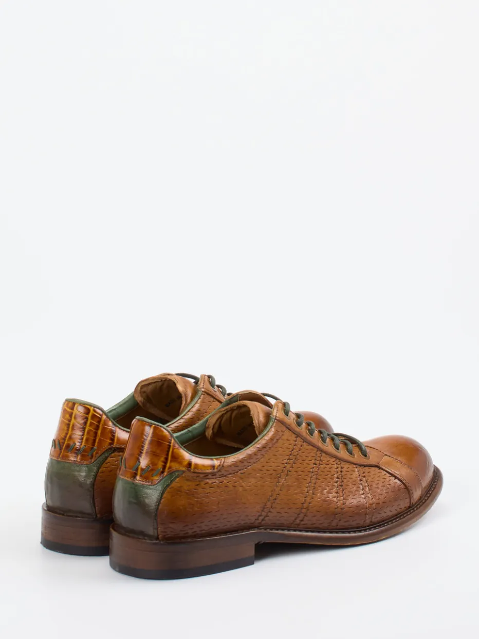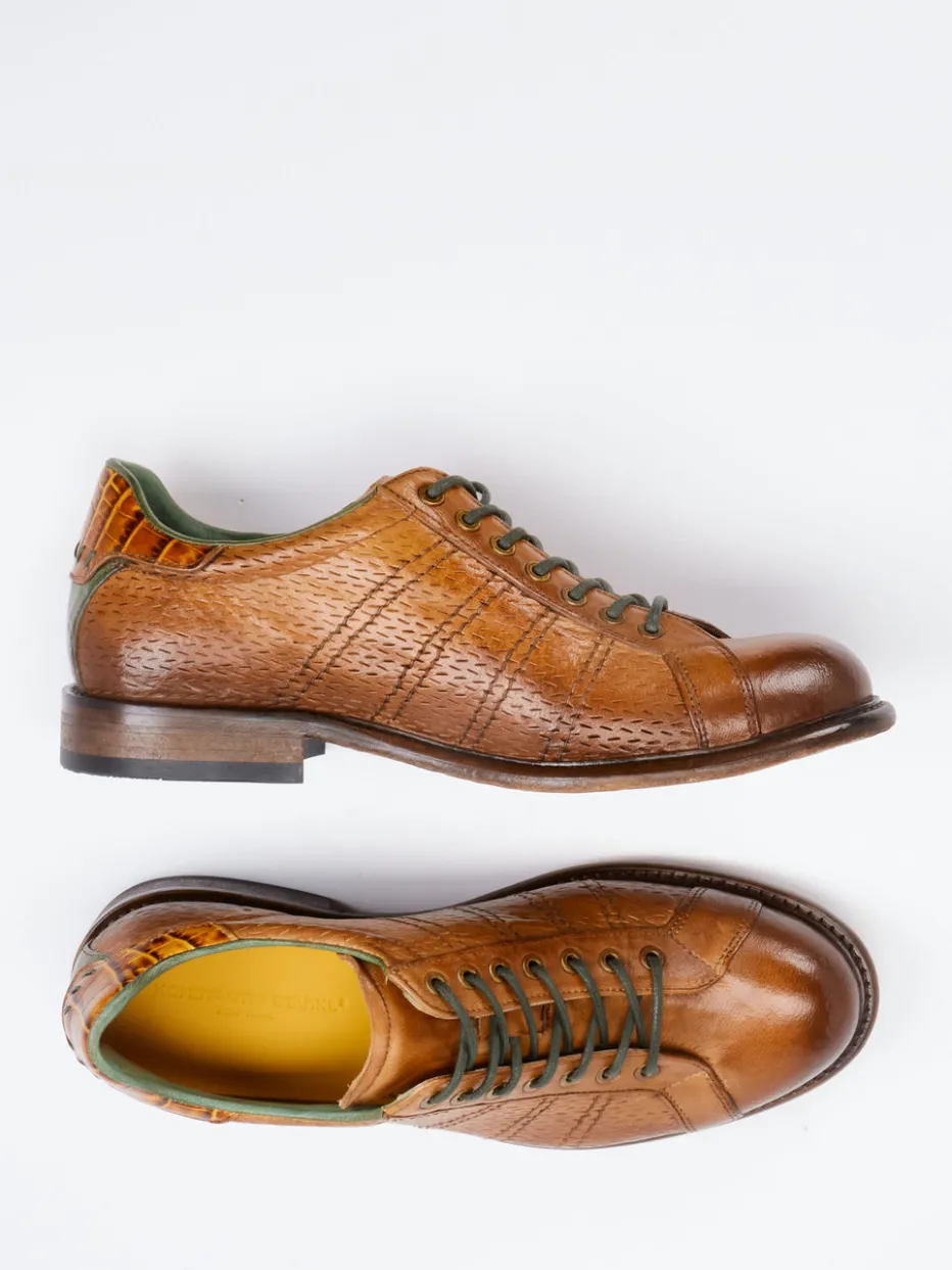 Mit glänzend geprägtem Kalbleder und kontrastierender Krokoprägung verbindet dieser Derby klassische Formgebung mit modischer Raffinesse.
