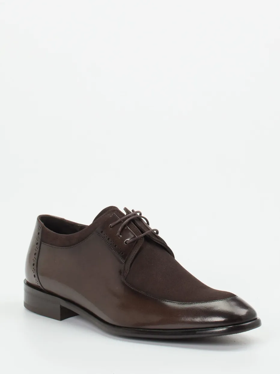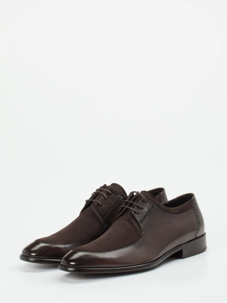 Der elegante Materialkontrast aus Glatt- und Veloursleder sowie eine edel geprägte Ledersohle kennzeichnen diesen Derby als stilvolle Wahl für formelle Anlässe.