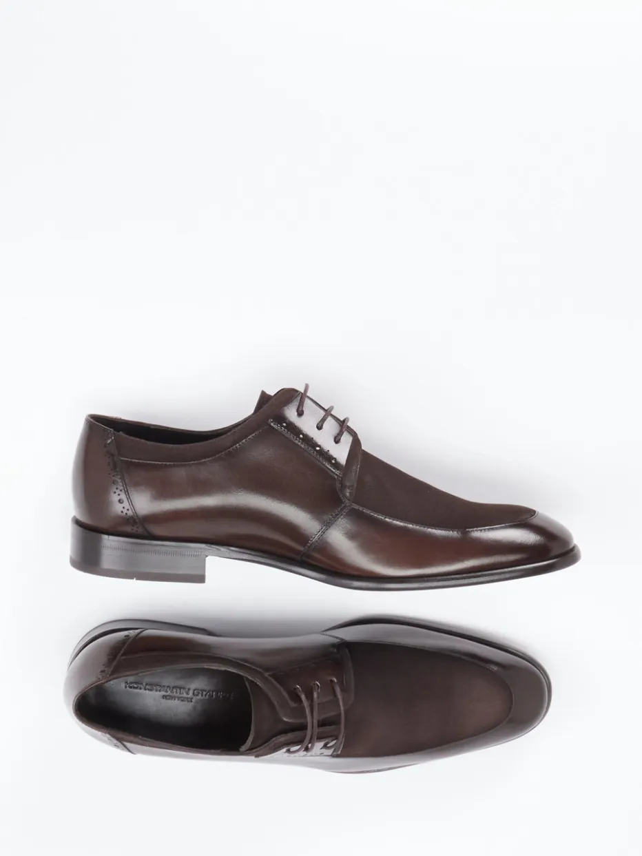 Charakterstarker Klassiker mit edlem Materialmix.Konstantin Starke präsentiert mit diesem Herren-Derby einen modischen Schnürschuh für gehobene Ansprüche. Ob im Büro oder bei festlichen Anlässen: Der dunkelbraune Derby überzeugt durch seinen fein abgestimmten Materialmix aus hochwertigem Kalbleder und samtigem Veloursleder auf dem Blatt. Die Kombination aus matter und glänzender Oberfläche, schlanker Silhouette und dezenten Broguing-Details an Ferse und Schnürung unterstreicht seinen klassischen Stil. Die geprägte Ledersohle sowie ein gepolstertes Fußbett sorgen für Komfort und Langlebigkeit. Ideal zu Anzughosen oder elegant-schlichten Kombinationen. Ein Modell, das handwerkliche Tradition und zeitlose Ästhetik verbindet.