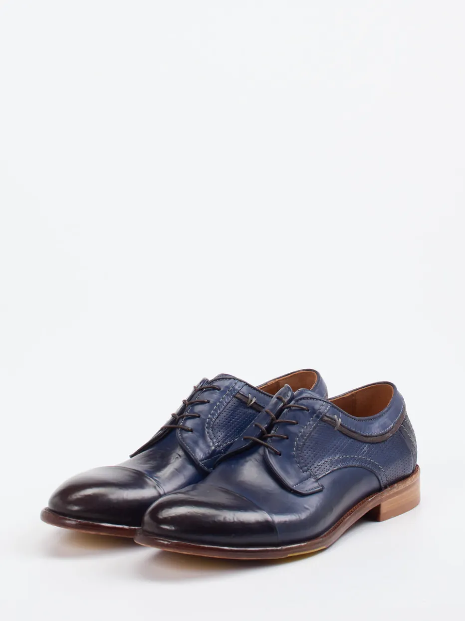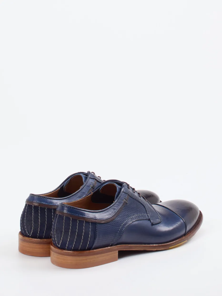 Ob im Büro oder beim gehobenen Freizeit-Look – dieser Schnürschuh überzeugt durch seine handwerkliche Verarbeitung und Details mit Charakter. Glänzendes, navyblaues Kalbleder trifft auf strukturierte Veloursleder-Akzente im Fersenbereich. Das Zwei-Ton-Design mit Kontrastnähten unterstreicht die klassische, flache Silhouette mit Minimalismus-Flair. Die Ledersohle mit gelbem Gummieinsatz sorgt für festen Stand und angenehmes Tragen. Perfekt kombinierbar mit hellen Business-Hemden oder dunklen Jeans.