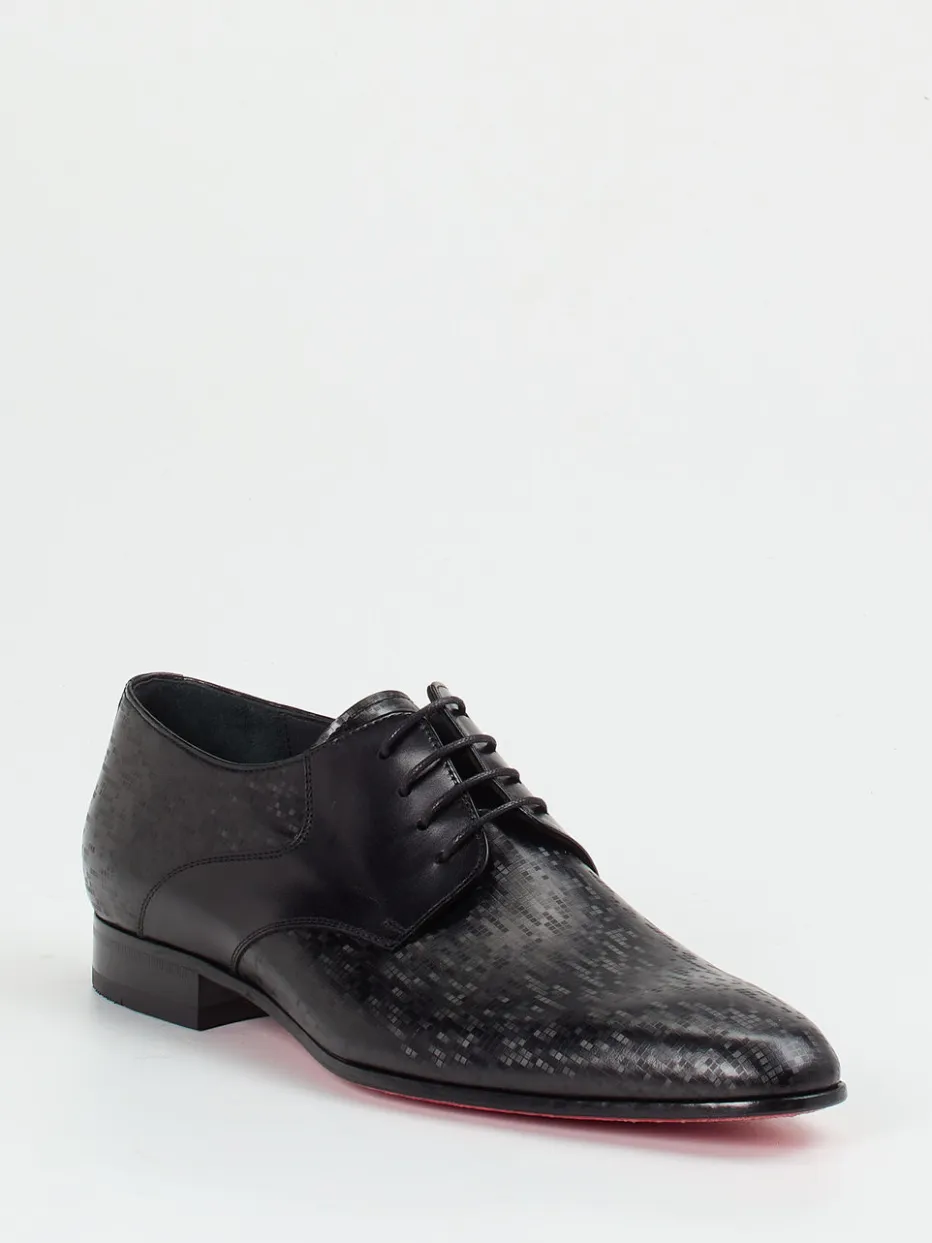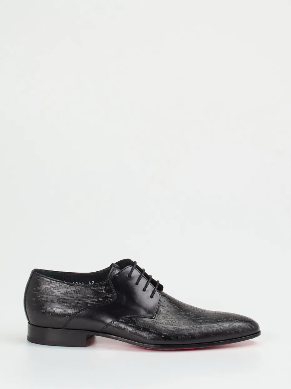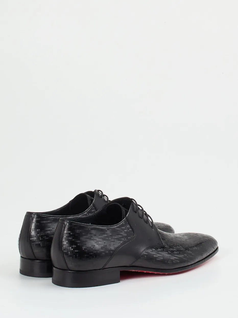 Markanter Derby mit glänzendem Pixelmuster aus hochwertigem Kalbleder. Die rote Ledersohle setzt ein modisches Statement im formellen Kontext.