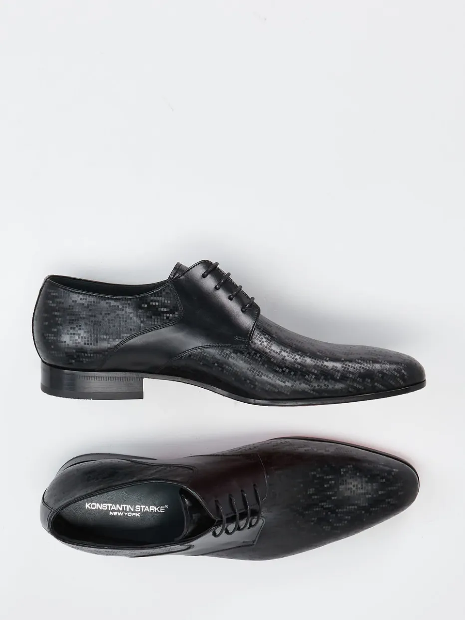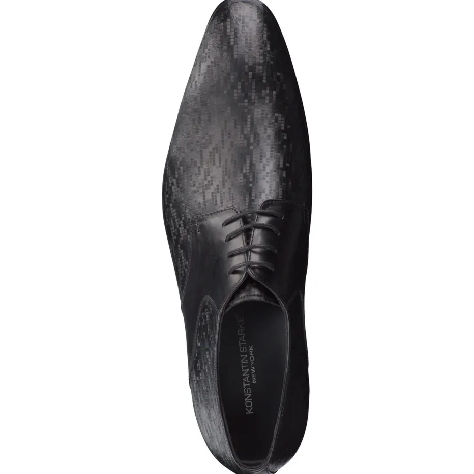 Formeller Look mit digitaler Raffinesse.Konstantin Starke präsentiert mit diesem Derby-Schnürschuh ein stilvolles Modell für Herren. Ideal für Geschäftstermine, Empfänge oder designaffine Abende: Das geprägte Kalbleder in tiefem Schwarz wirkt durch die pixelartige Struktur besonders modern. Die klassische, schmal zulaufende Silhouette wird durch die Ton-in-Ton-Schnürung unterstrichen. Highlight des Designs ist die rote, gummierte Ledersohle – ein subtiler Eyecatcher mit Streetwear-Attitüde. Strukturierter Minimalismus trifft modische Ausdruckskraft. Ein formal-eleganter Schuh mit komfortabler Innenausstattung, signiert von einem Markenklassiker.