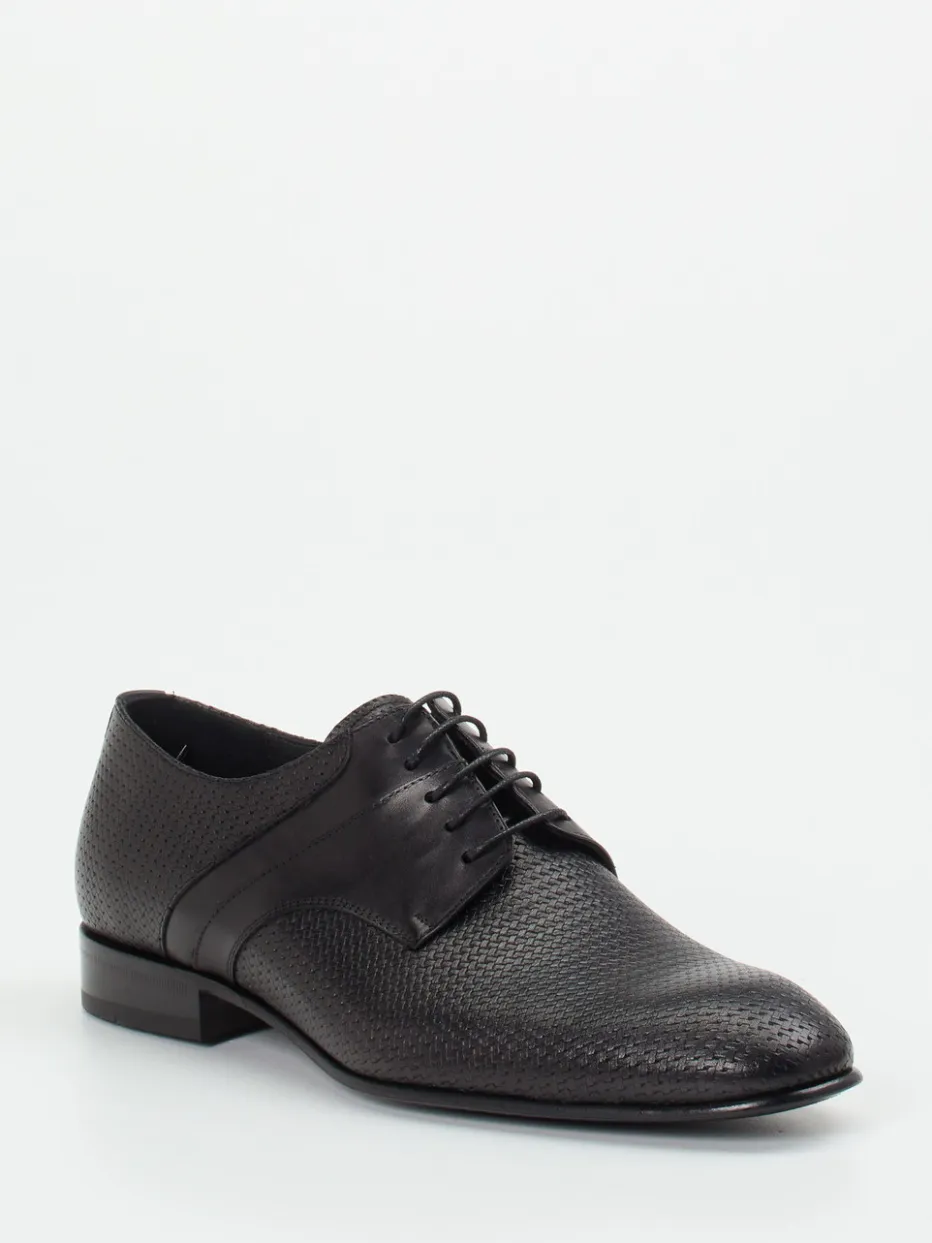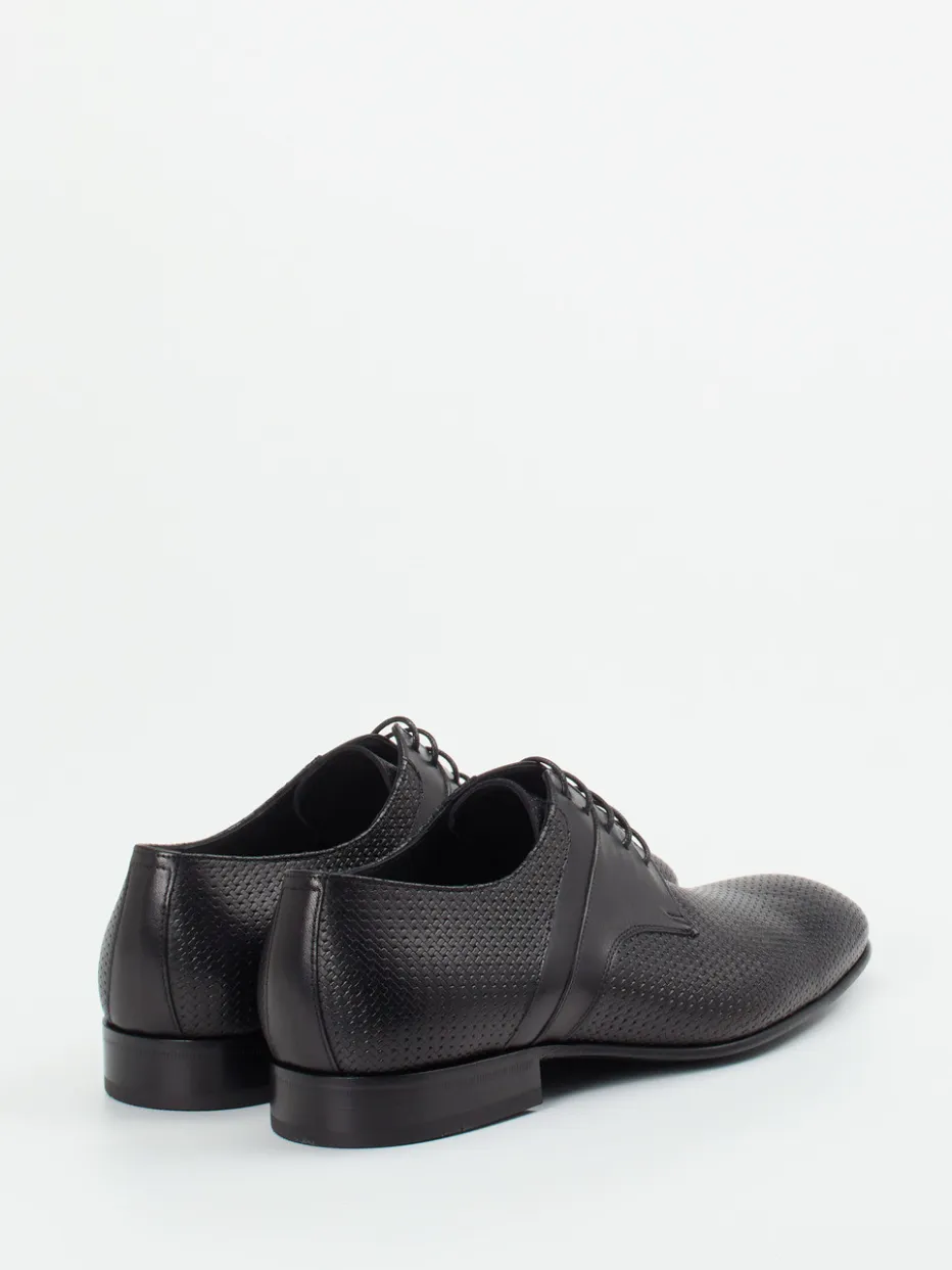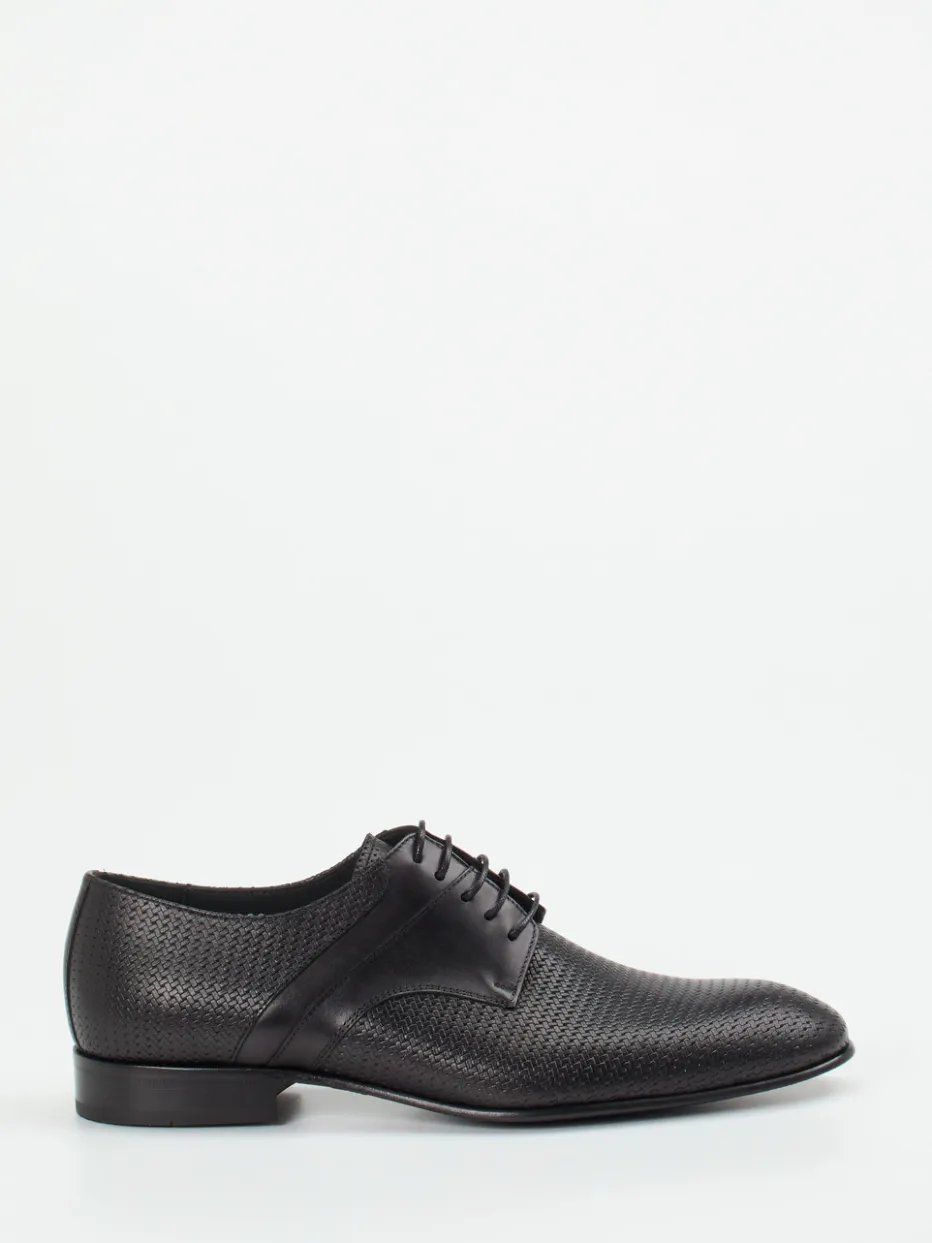 Struktur und Stil auf den Punkt gebracht.Konstantin Starke zeigt mit diesem Herrenschnürer in Derby-Form einen geschmackvollen Vertreter der Business-Classics. Für den souveränen Auftritt im Büro oder bei formellen Veranstaltungen bietet das geprägte Leder mit feiner Flechtstruktur eine markante Optik bei gleichzeitig dezenter Ton-in-Ton-Farbgebung. Die klassisch-langgezogene Form, eine geschlossene 5-Loch-Schnürung sowie die geprägte Ledersohle unterstreichen das elegante Erscheinungsbild. Schwarzes Kalbleder trifft hier auf ein zurückhaltendes, jedoch wirkungsvolles Design – passend zum Trend „Quiet Luxury“. Lässt sich ideal mit schwarzen Gürteln und anthrazitfarbenen Business-Hosen kombinieren. Markentypisch vereint: kompromisslose Qualität und minimalistische Ästhetik.