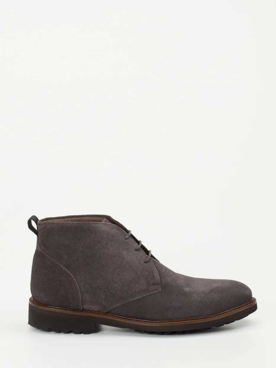 Schiefergraues Veloursleder trifft bei diesen Desert Boots auf funktionalen Minimalismus und zuverlässige Vibram-Profilsohle – ein stilvoller Begleiter für Alltag und Büro.