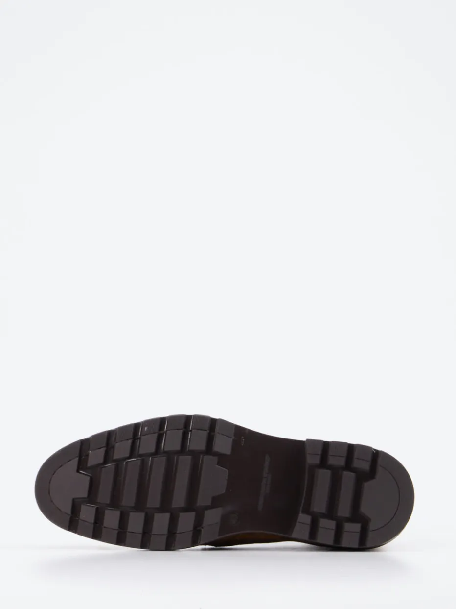 Das Obermaterial aus braunem Veloursleder überzeugt durch eine matte Oberfläche und eine dezente Ton-in-Ton-Nahtführung. Die knöchelhohe, rund zulaufende Silhouette wird ergänzt durch eine dunkelbraune Profilsohle aus Gummi, die festen Halt auf herbstlichen Untergründen verspricht. Eine klassische Drei-Ösen-Schnürung sowie ein weiches Lammfellfutter runden die komfortable Ausstattung ab. Die reduzierte Optik spielt mit Einflüssen aus Quiet Luxury und Heritage Menswear – ideal kombinierbar mit Wollhosen oder Chinos.