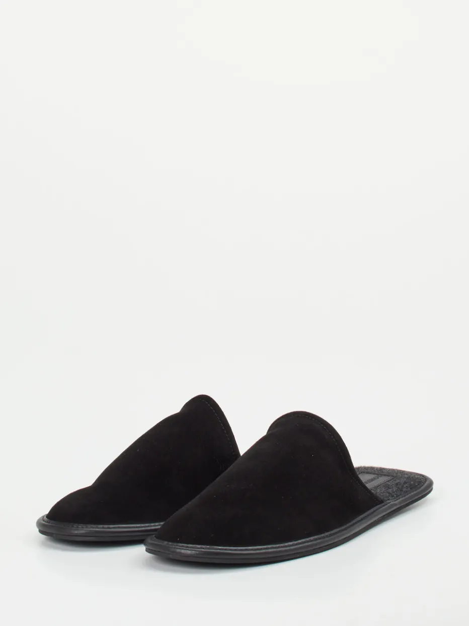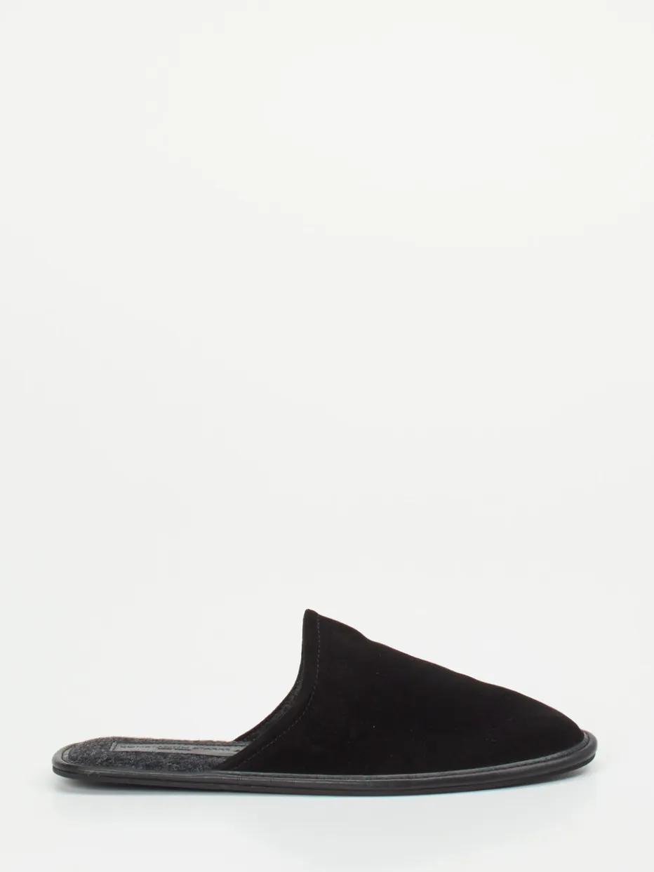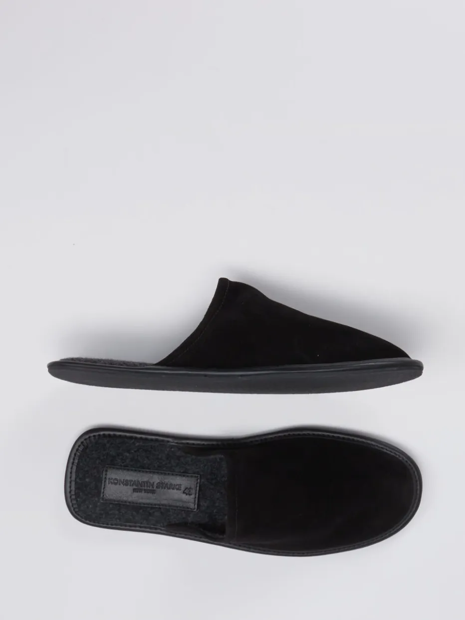 Stilvoll entspannen.Konstantin Starke interpretiert die klassische Herrenpantolette modern und hochwertig. Für entspannte Stunden daheim bietet dieser Hausschuh aus schwarzem Veloursleder mit samtiger, matter Oberfläche ein angenehmes Trageerlebnis. Die spitz zulaufende Form, offene Ferse und die gepolsterte Innensohle aus weichem anthrazitfarbenem Filzfutter sorgen für Komfort. Die flache Silhouette und das tonale Design unterstreichen den Einfluss von „Quiet Luxury“ und machen ihn zur stilvollen Homewear für den Winter. Besonders gut kombinierbar mit Loungewear in gedeckten Tönen. Verlässlicher Komfort mit zurückhaltender Eleganz für den stilbewussten Alltag im eigenen Zuhause.