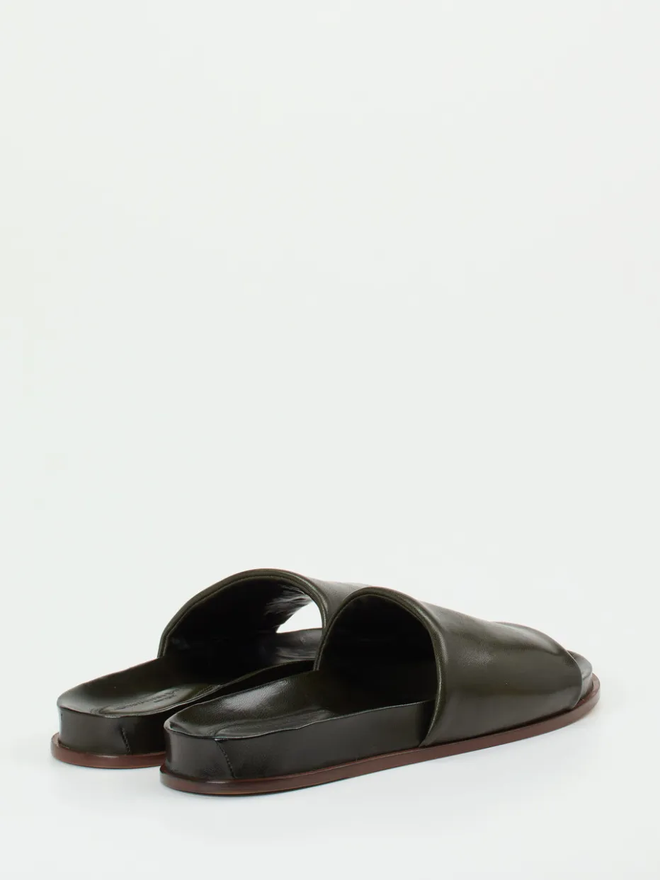 Stilsicher durch warme Tage.Konstantin Starke zeigt mit dieser Herren-Pantolette eine stilvolle Slide-Variante mit Anspruch. Ob auf Reisen, beim Stadtbummel oder zu Hause – das dunkelolivgrüne Lammleder überzeugt mit glatter, leicht glänzender Oberfläche und weicher Haptik. Die Kontrastlaufsohle aus Leder und Gummi sorgt für sicheren Schritt, während die gepolsterte, ergonomische Innensohle spürbaren Komfort bietet. Das Design bleibt schnörkellos: offene Zehenpartie, flache Silhouette, klare Linien – ganz im Sinne von Quiet Luxury und aktuellen Monochrom-Trends. Kombiniert mit Leinenhose und Oversized-Hemd entsteht ein zurückhaltend-eleganter Look. Ein urban entspanntes Sommer-Essential in kompromissloser Qualität.
